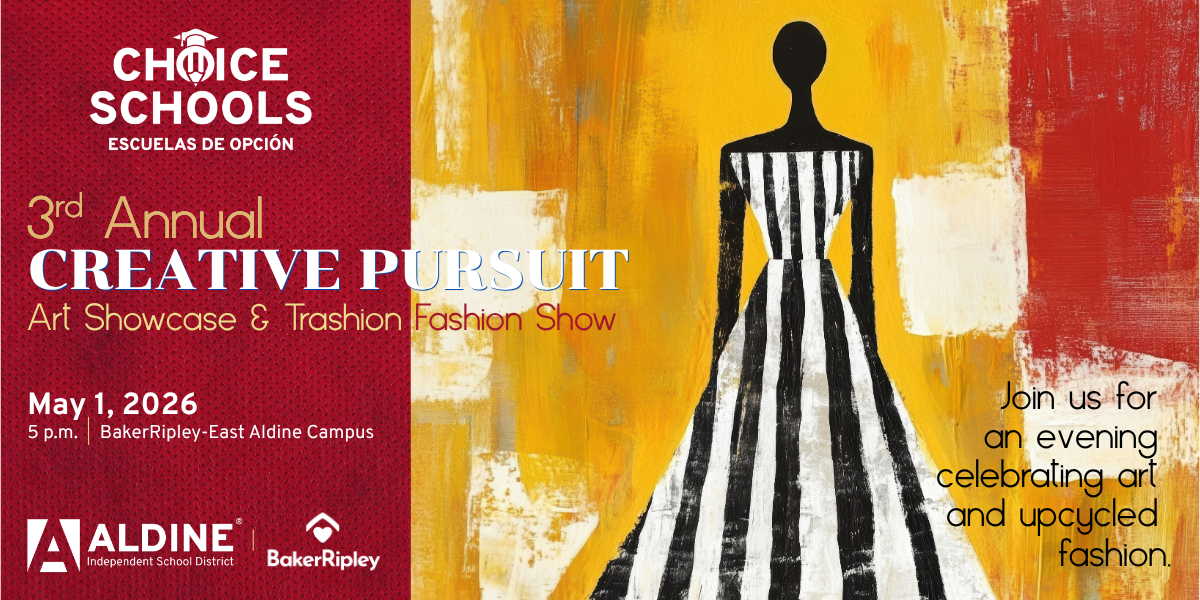 The Aldine ISD Office of Choice Schools invites families and community members to attend the third annual Creative Pursuit Art Showcase and Trashion Fashion Show, a collaborative event highlighting student innovation, artistic expression, and sustainability.