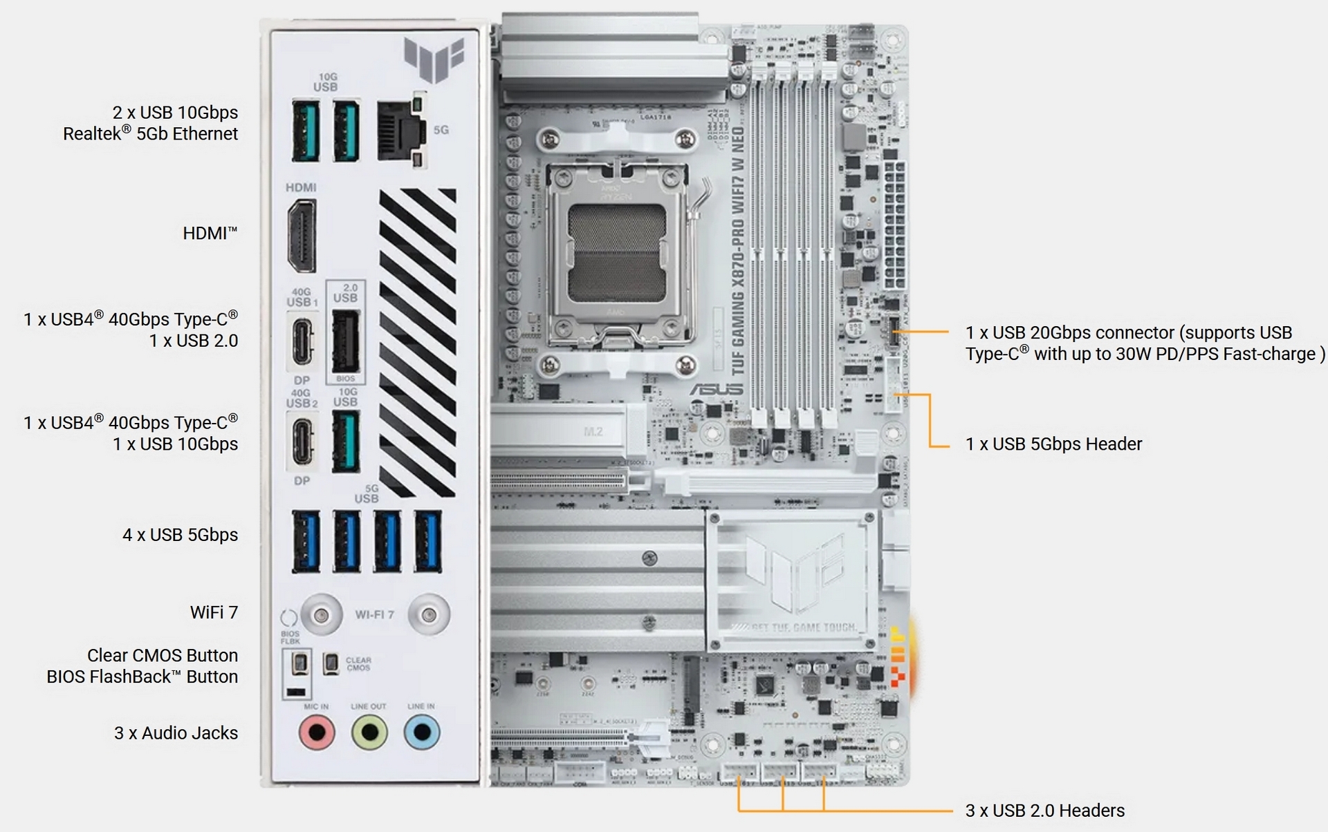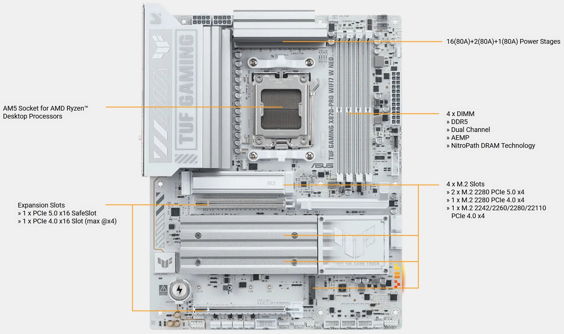 The next batch come from ASUS. Famous for their ROG range, recent times have seen improvements in the TUF Gaming lineup. Once the purview of the market entry level, the TUF range is now as capable as most. Certainly any and all that exist at this price point. The X870-Pro W NEO is the model up today. The W, as you might have gleaned from the image below, stands for white. We’ve seen many white offerings recently, and most of them are as silver as they are white. The TUF leans very heavily into this palest option. Even the plastics are white, with light grey used if there is a need to differentiate close grouped headers.