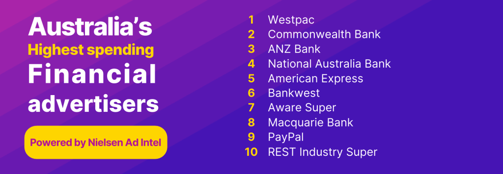 The Nielsen Ad Intel data points to a market where major banks, payment providers and superannuation brands are competing harder to stay visible, strengthen brand position and win attention across a wide range of financial decisions, from everyday banking through to lending, business services and long-term savings.