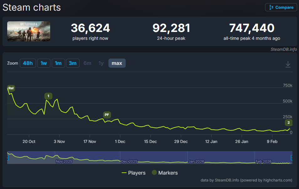 To put this into further perspective, ARC Raiders was released just a couple of weeks after Battlefield 6 and had a peak player count of 481,966 users on Steam. In the last 24 hours, it hit a peak of 215,978 users.