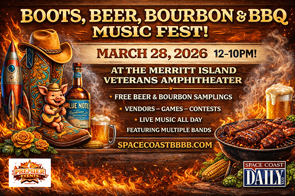 The Boots Beer Bourbon and BBQ Music Fest is presented in partnership with Space Coast Daily and Premier Events and will take place at the Merritt Island Veterans Amphitheater.