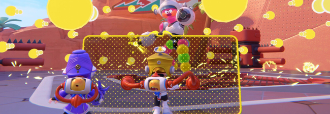 You and another player go through numerous linear stages, and each player is assigned two colors that they can switch between instantaneously. Enemies, and other stage mechanics, are often associated with a color, so the designated player with the matching color are the only ones that can either damage the opponent or engage with the stage mechanic. For instance, a rotating pillar that has yellow lasers spewing out of it can only be blocked with a player’s yellow barrier tool.