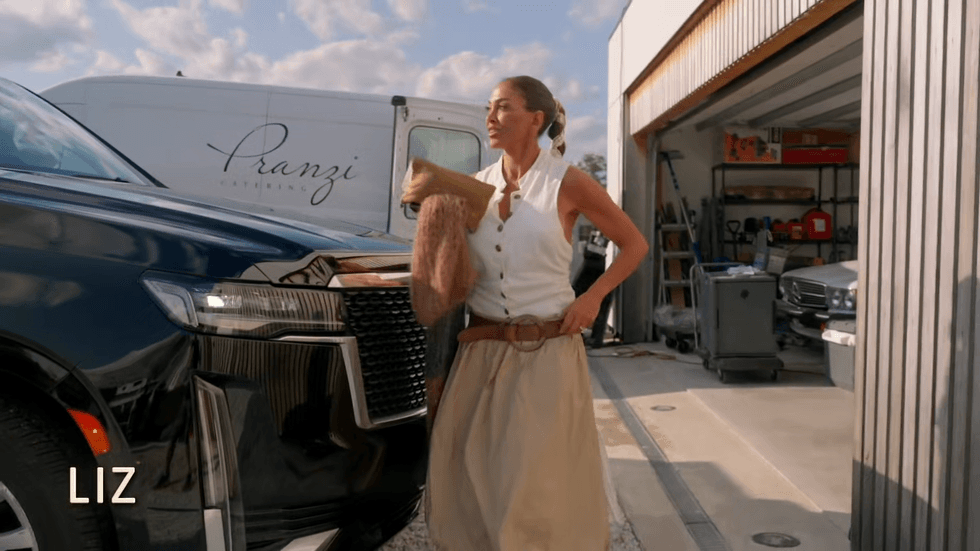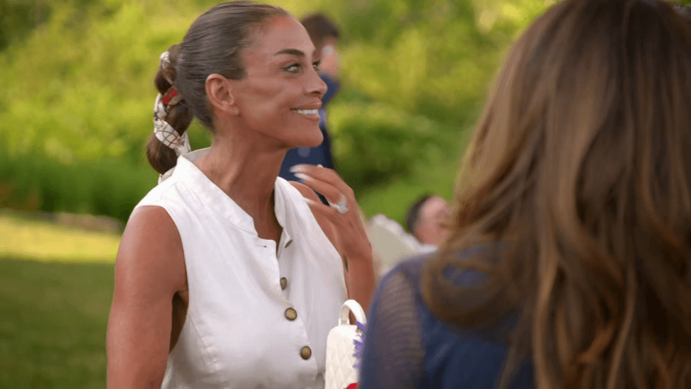 All in, I’ve never met a woman like Liz here, which gives me profound sadness, because she’s the only woman I think I want to know from now on. She’s hot and dresses like it, two things that work well to endear me to a new Housewife. I love this I Dream of Jeannie drag she has on in the confessional booth. I do not love this wide-sleeved, jacquard something or other she has on in the second confessional booth. Thankfully, I don’t care, because at least the lady is dressing.