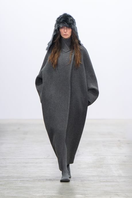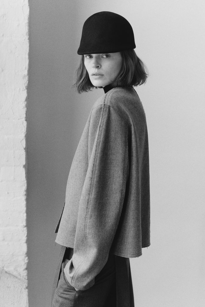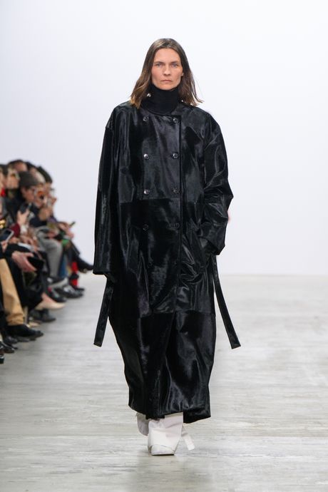 I loved a lot of Howie’s collection for Fforme, and her idea of exploring an American style as it was once practiced in the better workrooms of Seventh Avenue. She also brings a relevant Margiela anti-luxury flavor to her clothes and the styling, notably with its blunt line and a few shearling trapper hats. (Margiela images were on her mood board.) In addition to dark wool for her expert tailoring, Howie worked with a gorgeous French panne velvet for a coat and a trouser suit, and, as well, black hair calf for a long, loose coat.
