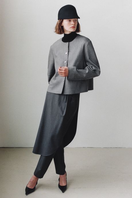 She told me that pattern-making is her biggest expense, and that shows in the thoughtful cut of her clothes, like a neat jacket in a black nubby tweed that kicks out a little in the back and goes with a pencil skirt finished at the waist with insets of blackand python-embossed leather. She used the same python leather—from a roll of dead stock—for a pencil skirt worn with a clingy mock turtleneck. The collection has a lovely, subtle sense of the designer’s native Ireland, notably in Aran sweaters (made from soft Italian yarns) and a hairy v-neck sweater in mist gray. I’m not sure which continent a pair of flannel trousers layered with a half wrap skirt lands on, but it’s a great look that feels new.