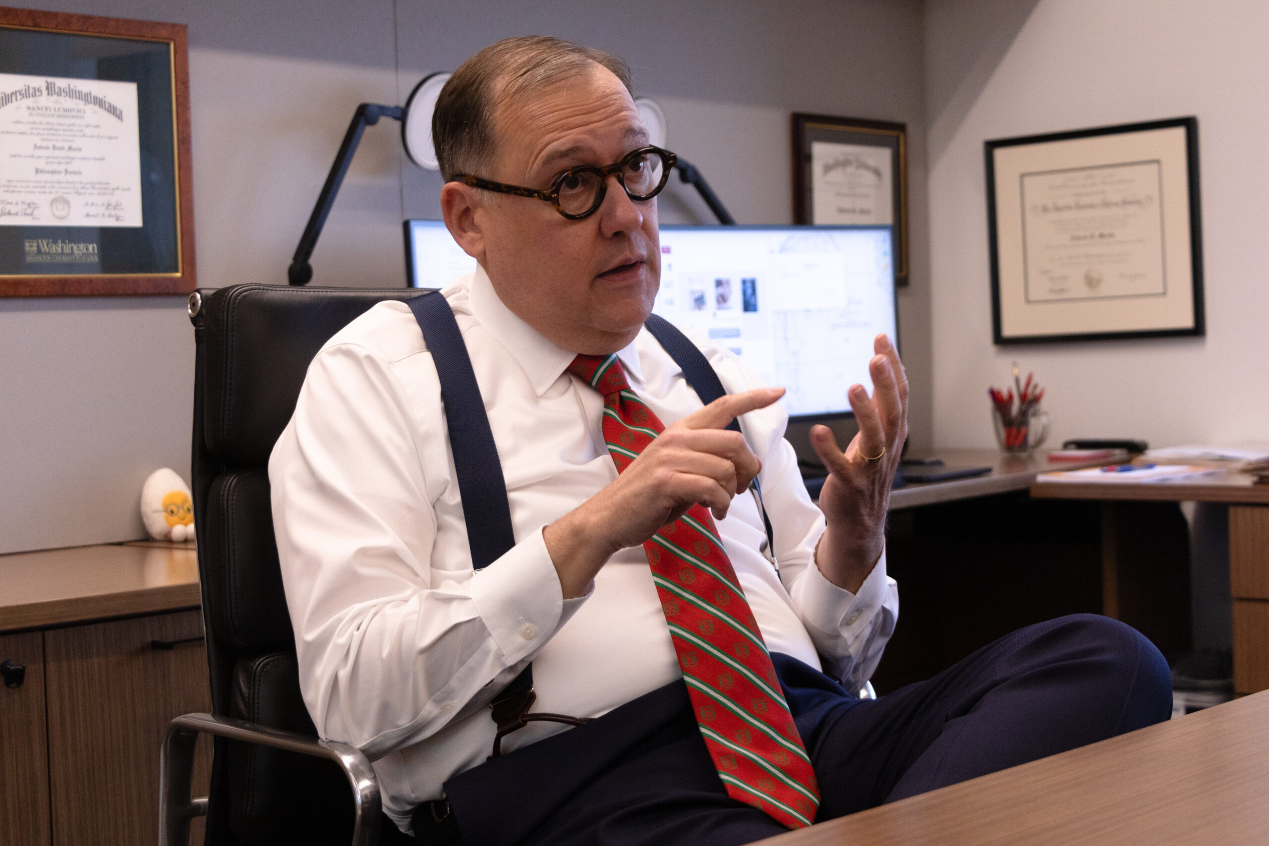 WashU Chancellor Andrew D. Martin defended the decision to meet with the Trump administration in the fall, discussed the impact of AI on higher education, and talked about emergency preparedness in a Q&A with Student Life on Wednesday, April 1. Martin also shared updates on WashU’s financial situation, including the reasons behind the transition to Workday, the University’s construction planning, and the decision to purchase the University of Health Sciences and Pharmacy (UHSP).
