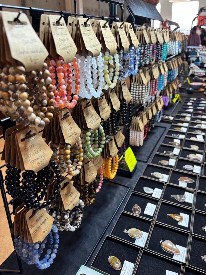 Colorful gemstone bracelets and handcrafted jewelry line a vendor display at the Crystal Festival, where attendees can browse a wide selection of minerals, crystals, and artisan creations during the two-day event in Mt. Pleasant.