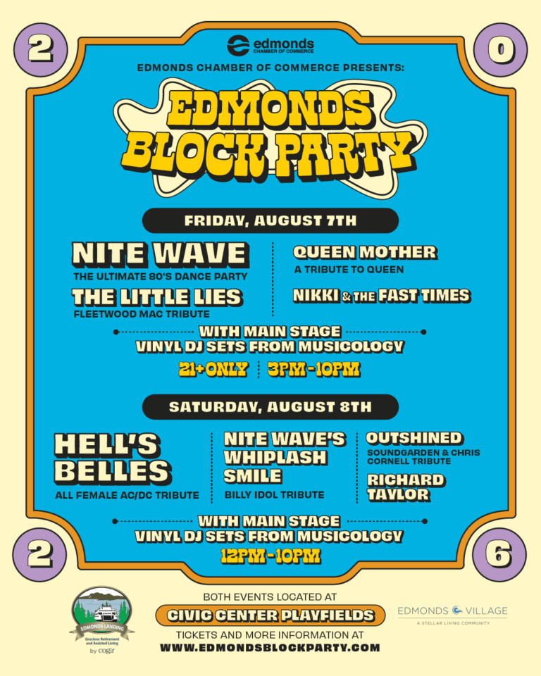 The Edmonds Chamber of Commerce has announced the official music lineup for the return of the Edmonds Block Party, happening Aug. 7-8, 2026 at the Civic Center Playfield. This summer celebration promises two unforgettable days of live music and community connection, the Chamber said. Two-day VIP and General Admission tickets are on sale now at an early bird rate.