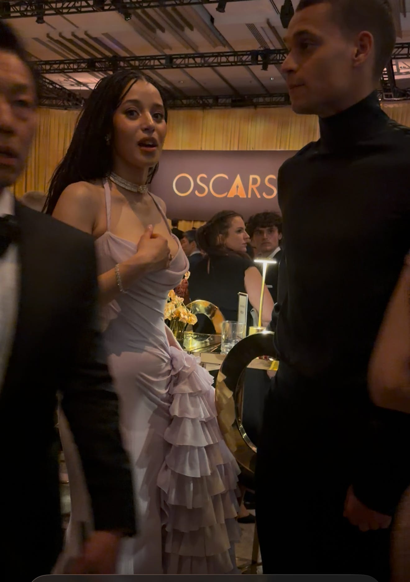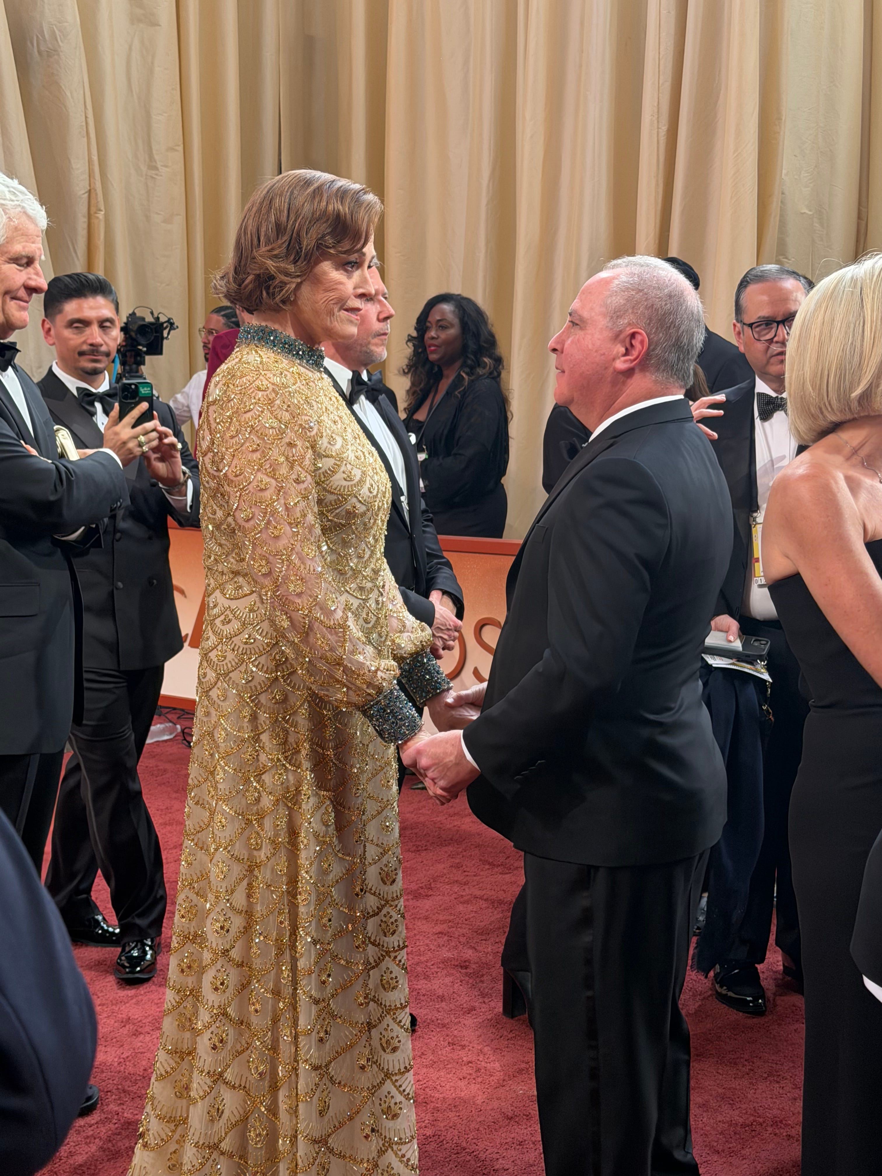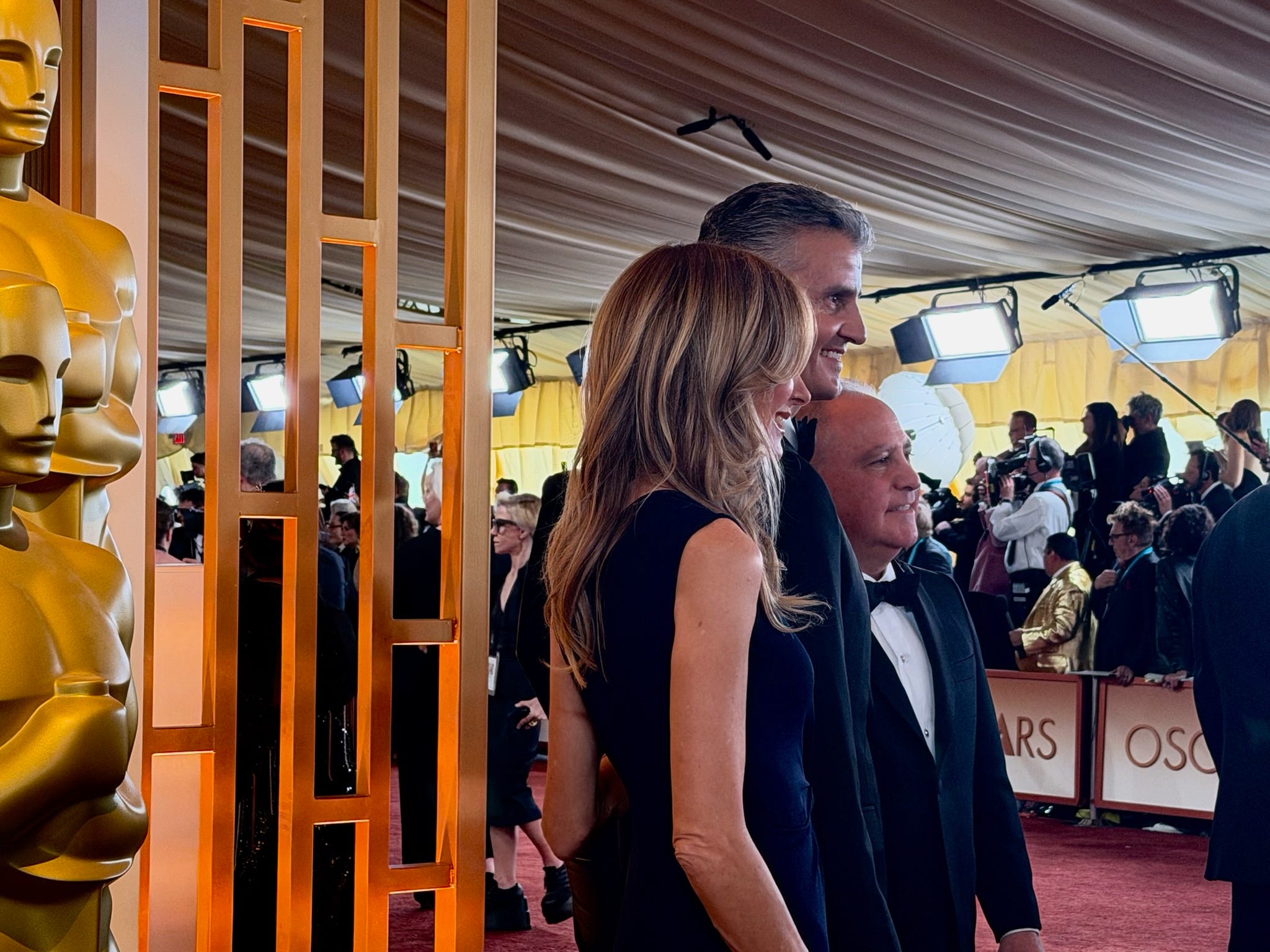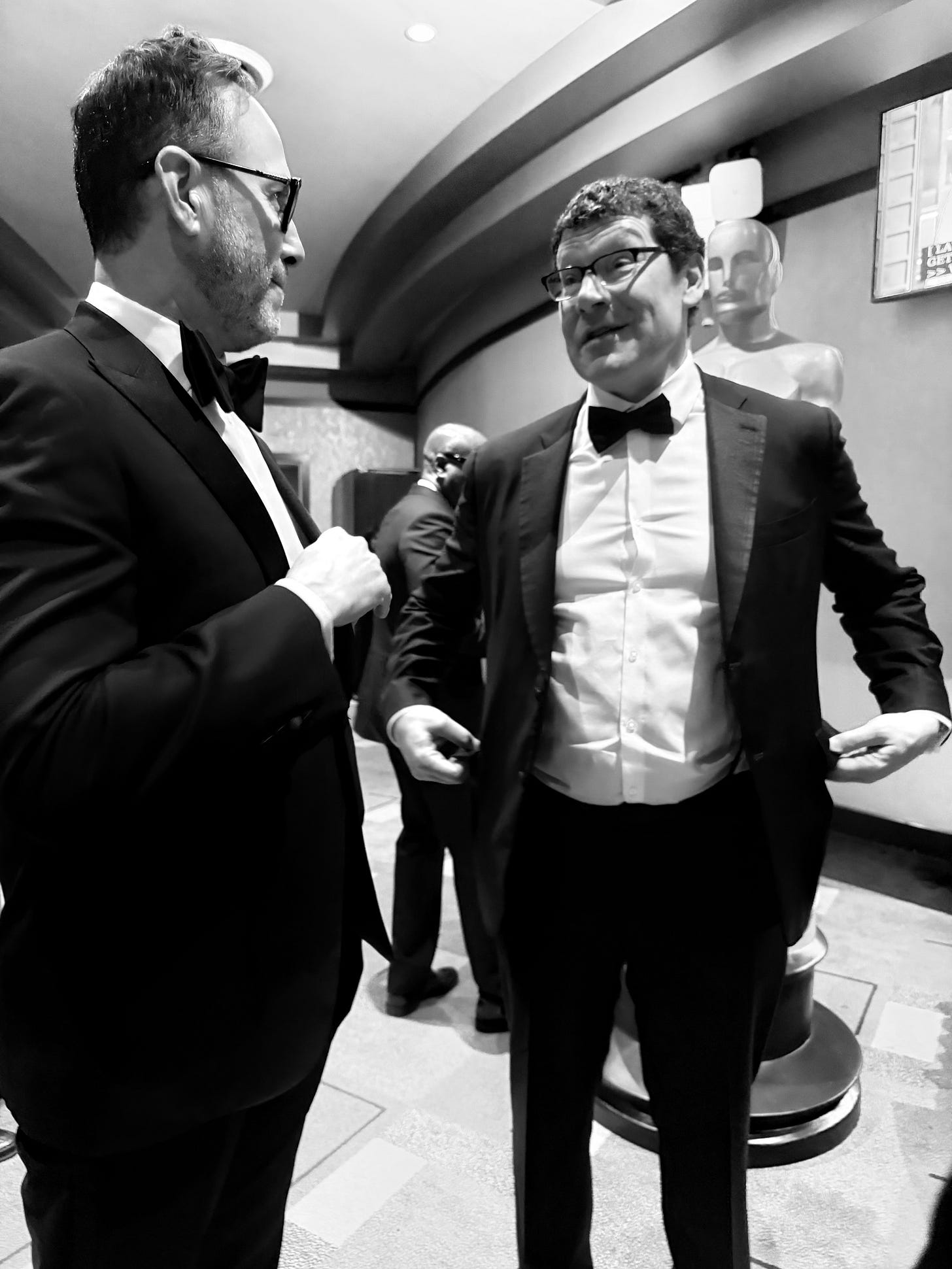 Warners production boss Jesse Ehrman, left, at the Dolby Theatre bar as Weaver and Pedro Pascal presented best visual effects (which Avatar: Fire and Ash won).