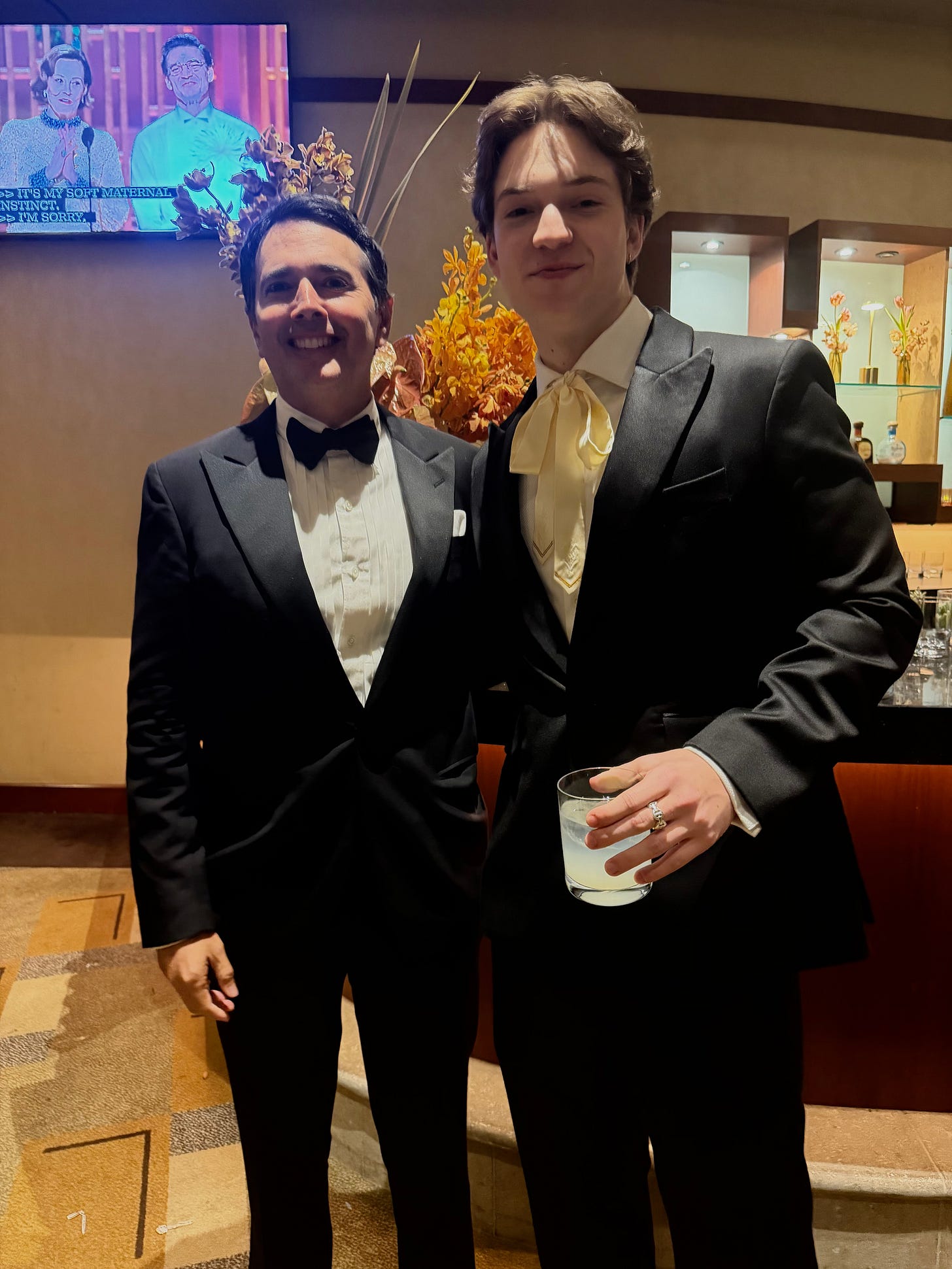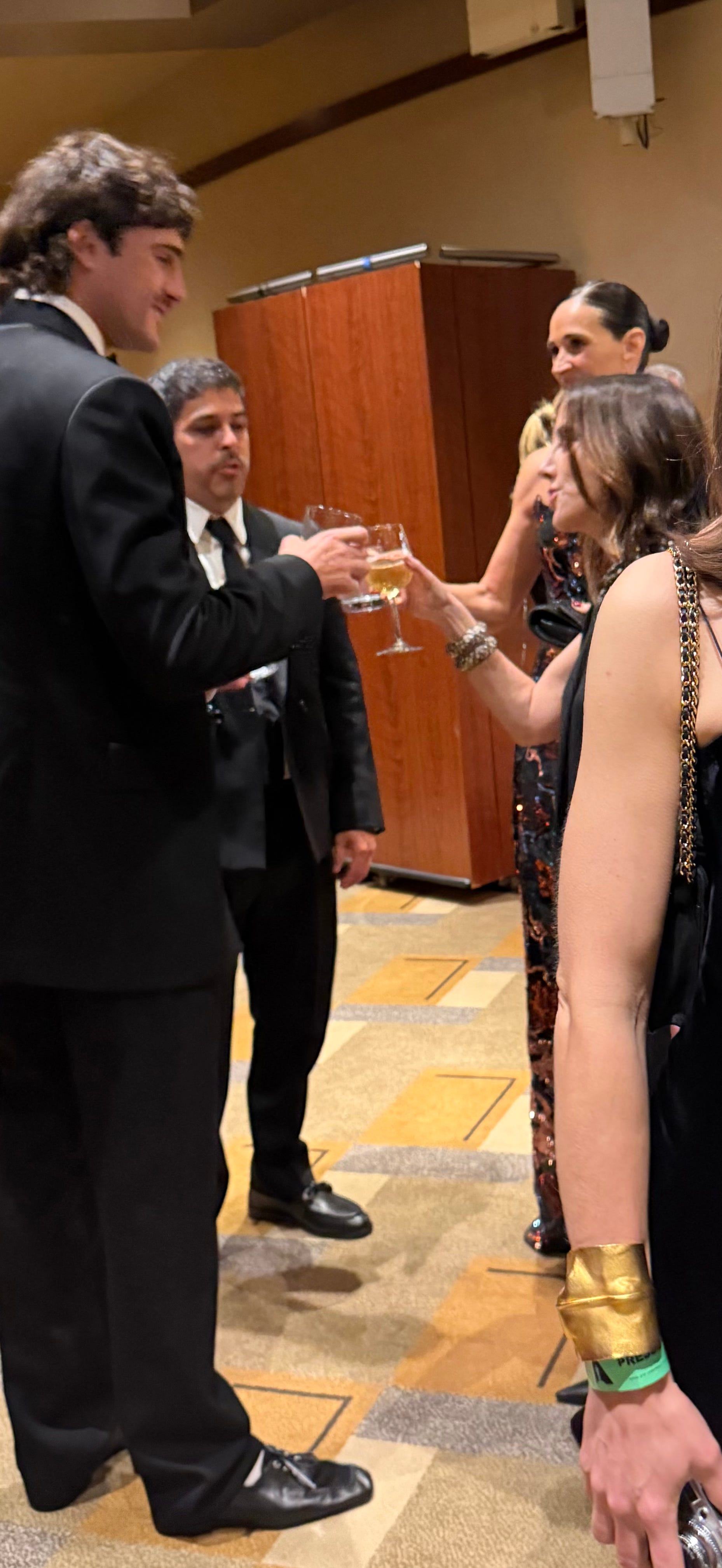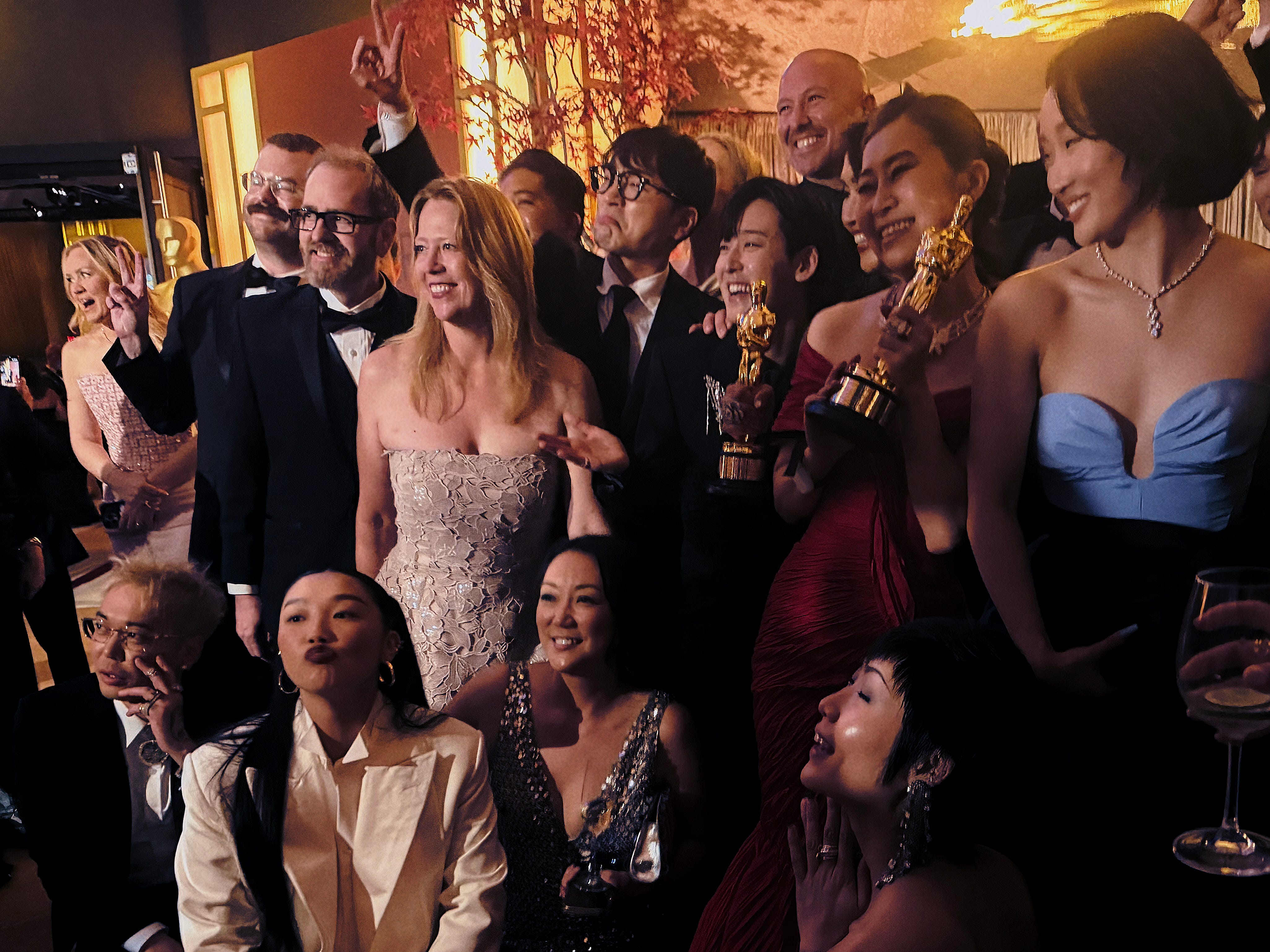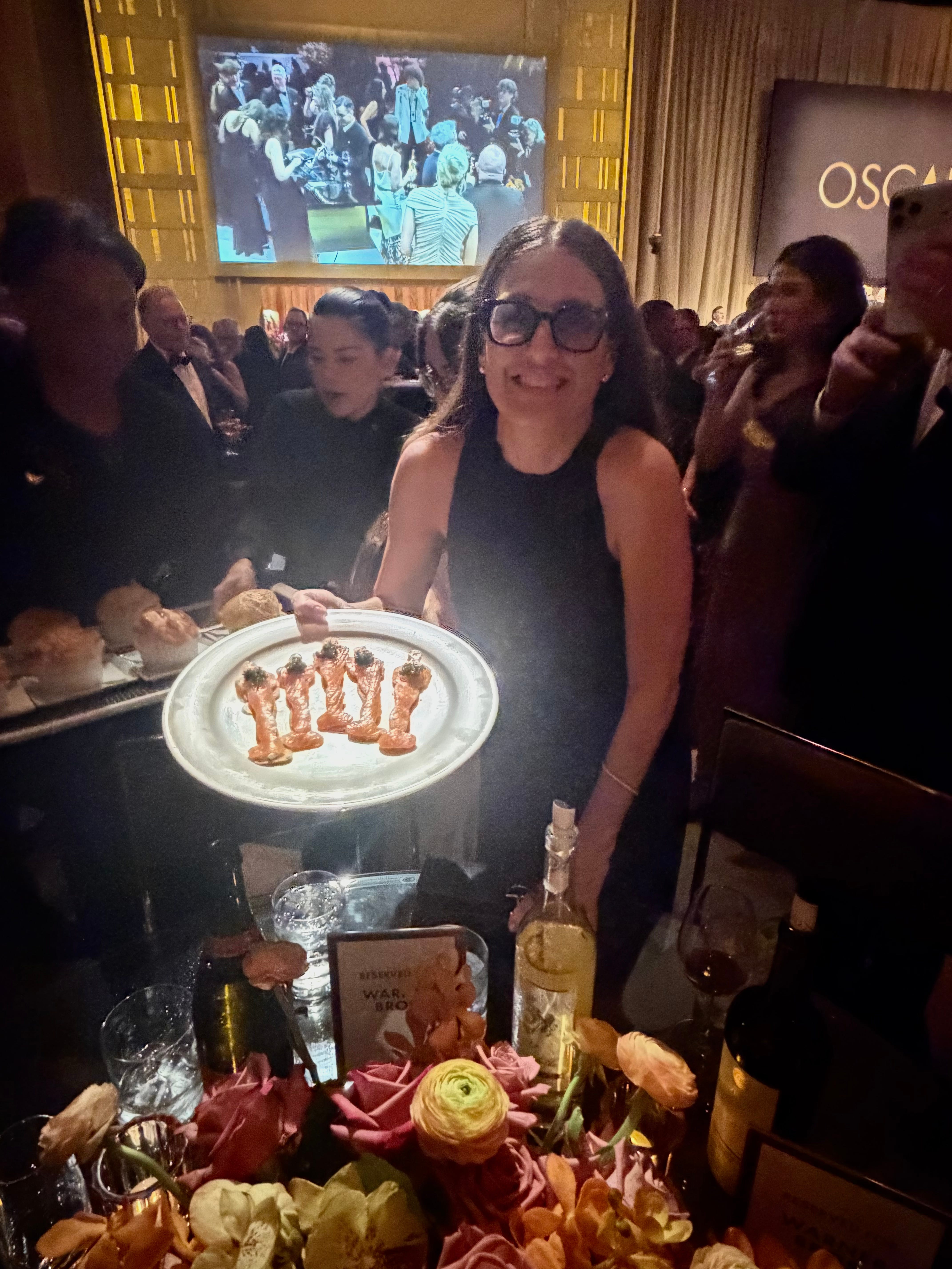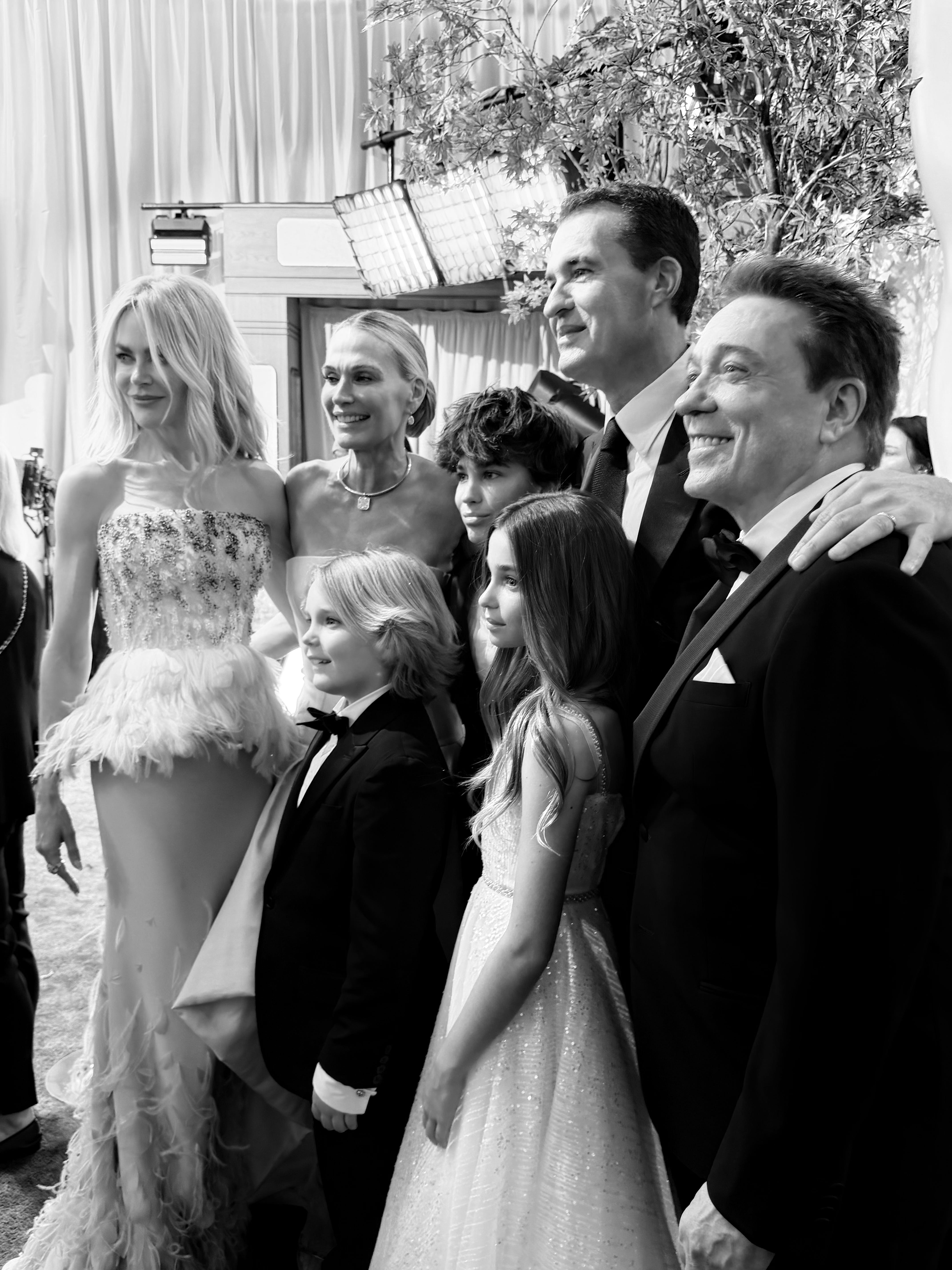 Here’s to the monsters in us all. Frankenstein Oscar nominee Jacob Elordi, left, and his mother, Melissa, far right, toast to the night. (Jacob and Melissa are the very tall ones!)