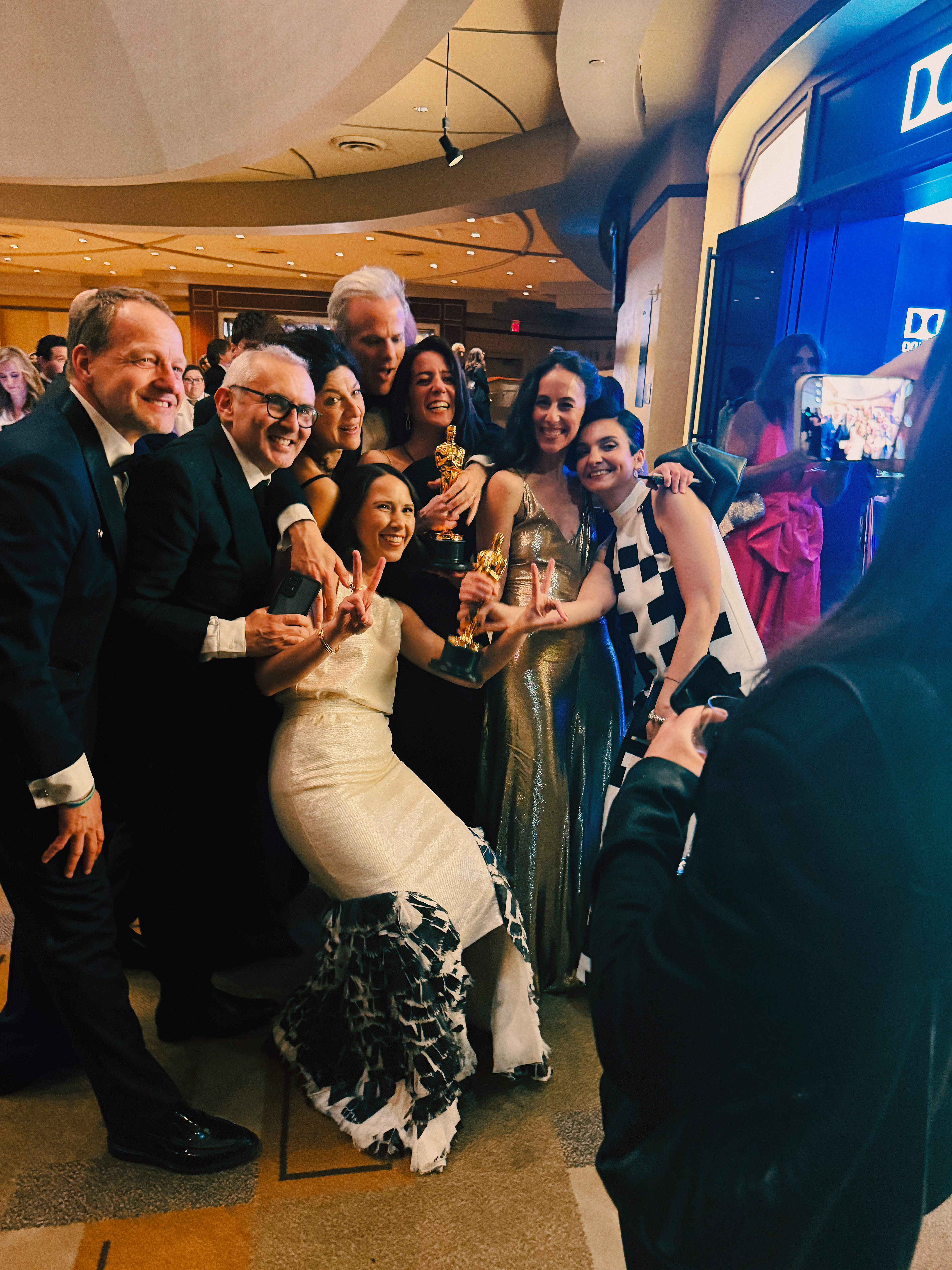 Natalie Musteata, center, flashes a peace sign. The co-director of live-action short co-winner Two People Exchanging Saliva was part of one of the night’s biggest surprises: a category tie.