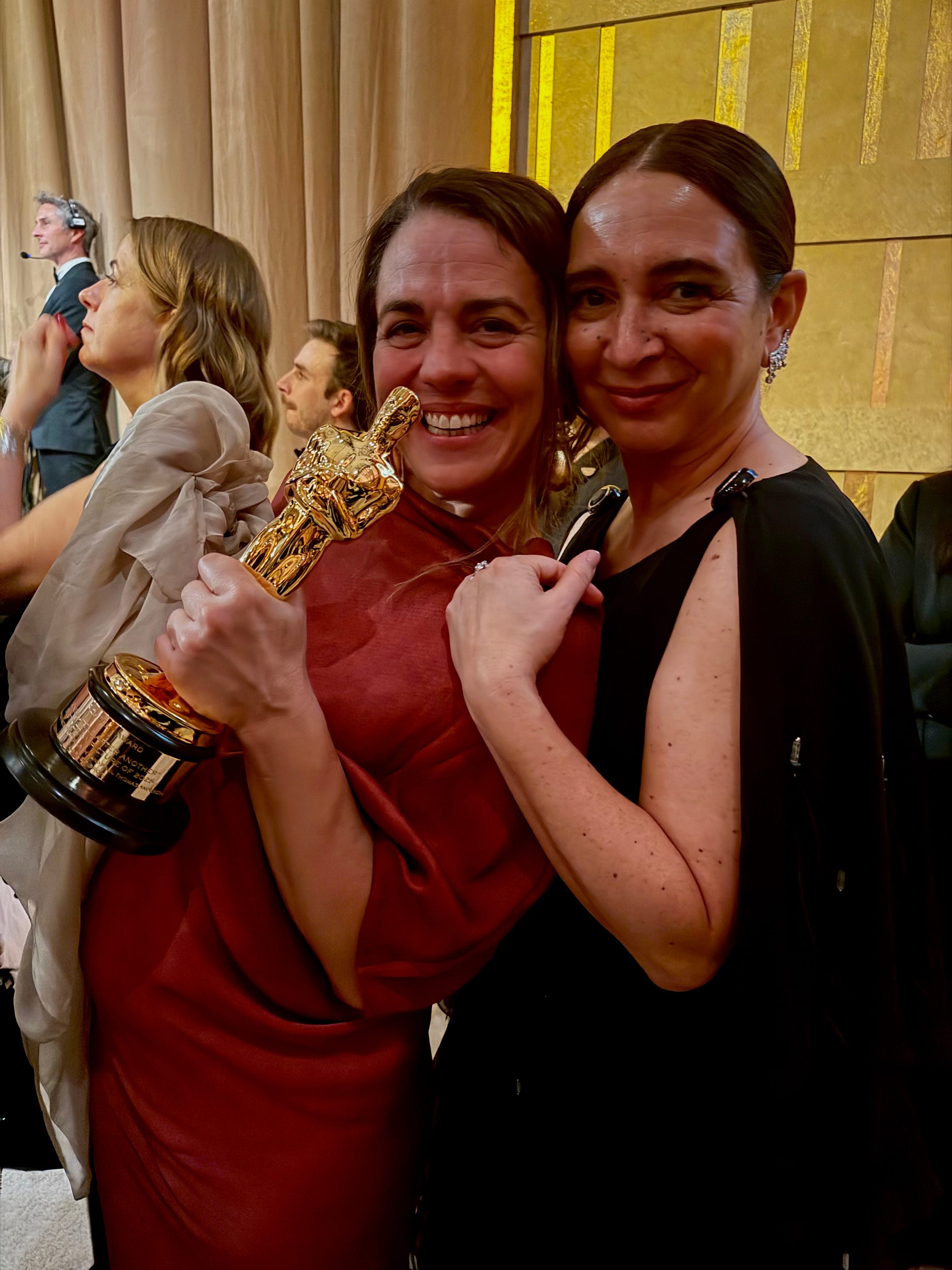Carmen Ruiz de Huidobro, left, the wife of the late Adam Somner, who was awarded a posthumous Oscar as producer of One Battle After Another, and Maya Rudolph.