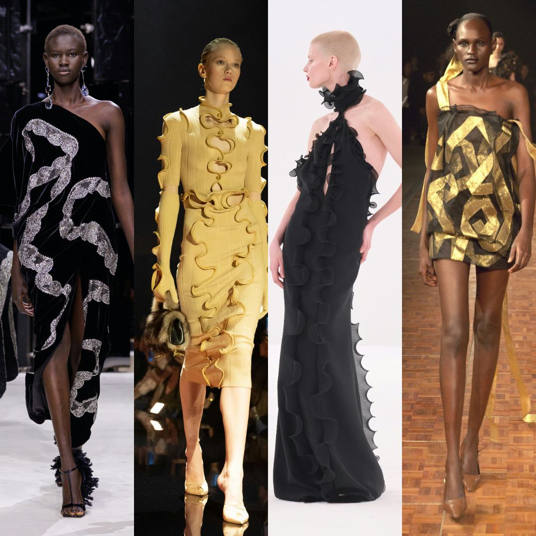 No offense to any one in particular, but if we see another black bias-cut slip dress as an evening-wear option, we might gouge our eyes out. Our favorite late-night looks had weird ribbons and squiggly lines throughout, like Area’s cassette-tape minidress and Tom Ford’s goth jellyfish.