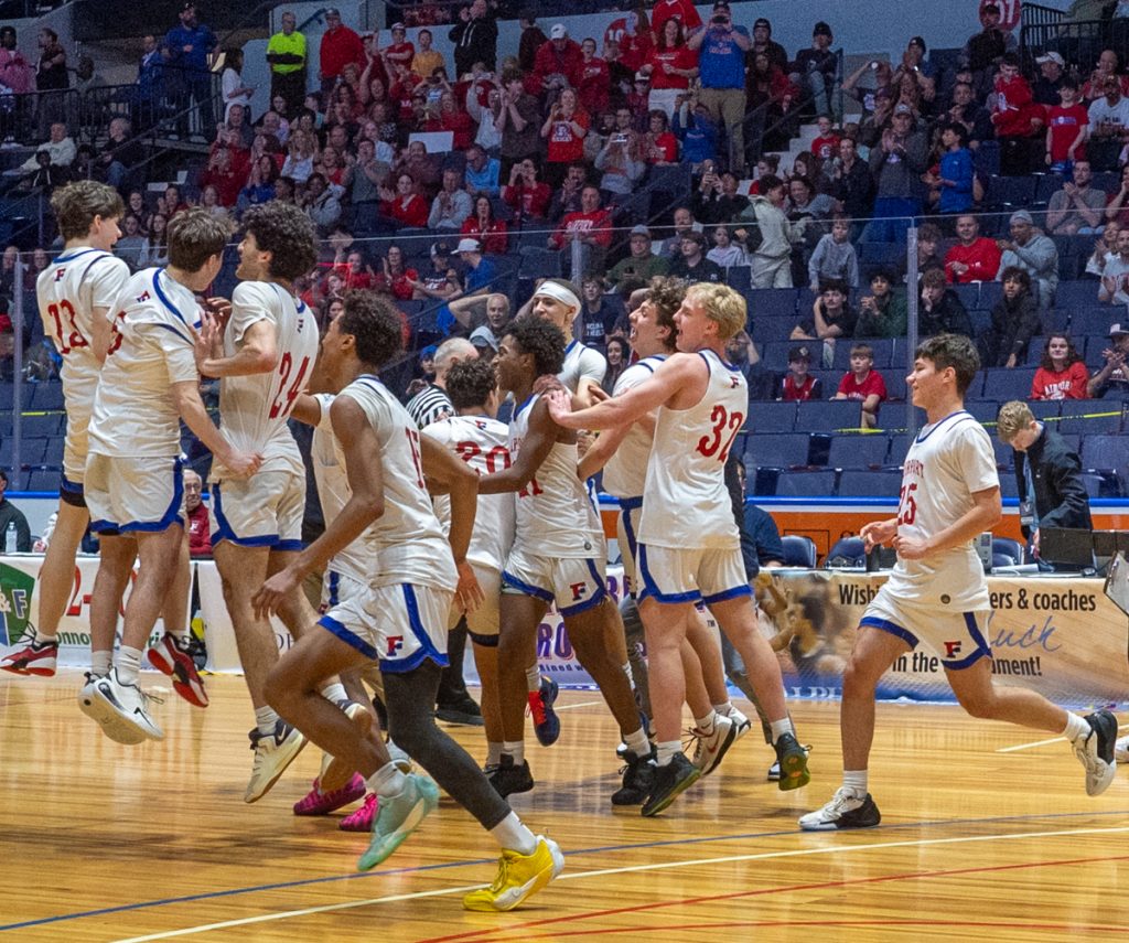 The Fairport Red Raiders boys’ basketball team celebrating after winning the Class AAA championship on Saturday, March 7, 2026. (Photo: JENNIFER LAEMLEIN)