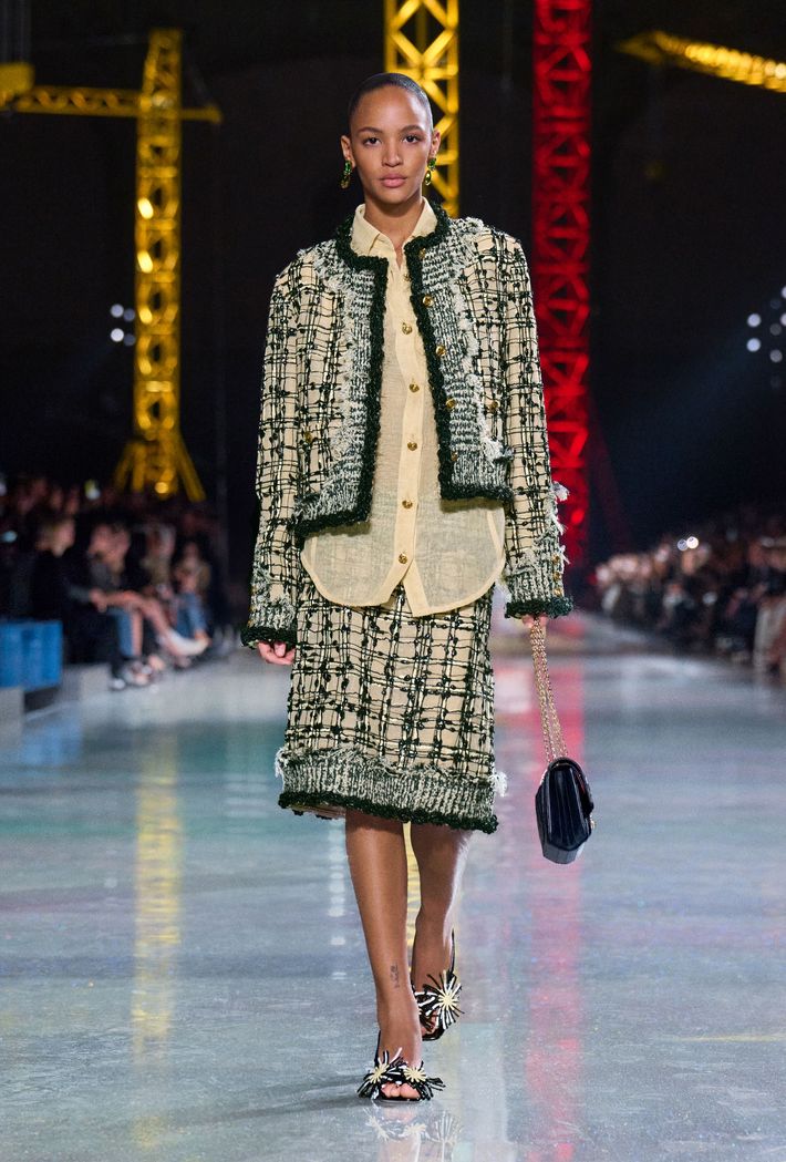 Matthieu Blazy opened the Chanel show with a black sweater and skirt and closed it with a black jersey gown adorned with a black camellia. A perfect circle. Let’s begin again. Or: Where does the present end and the future begin? In between those two points, Blazy offered a riot of color and ideas. The ribbed knits at the start were the Chanel suit reinvented, a nod to the track fleece or quarter-zip. There was an inspiring number of sporty separates — overshirts, untucked gauze blouses with suits, and a gray cardigan layered under a tweed blouson. There were new proportions, like a drop-waist dress with a belt set loose at the hips based on a style by Gabrielle Chanel in the 1920s. Some tweed outfits that were actually prints on silk viscose for lightness.