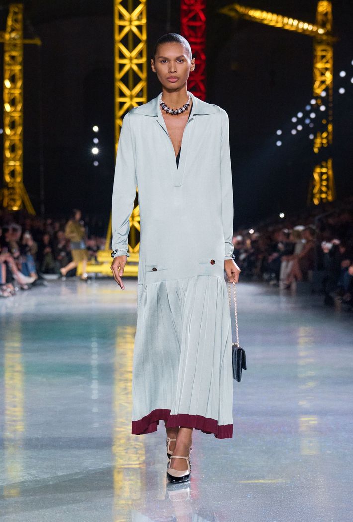 Most intriguing about this collection is the progress Blazy has made — and will make — in widening our perspective of Chanel and fashion. One of my favorite looks was a long polo-neck dress in pale-blue jersey with a drop-waist and a hem banded in burgundy, like the tip of a Chanel shoe. Blazy told me he almost struck the look from the lineup, wondering if it was too commercial. He went outside to have a cigarette and a think. The model came with him. He said, “She was smoking with me, leaning against the wall, and I thought, She looks fabulous. It works in the real world.