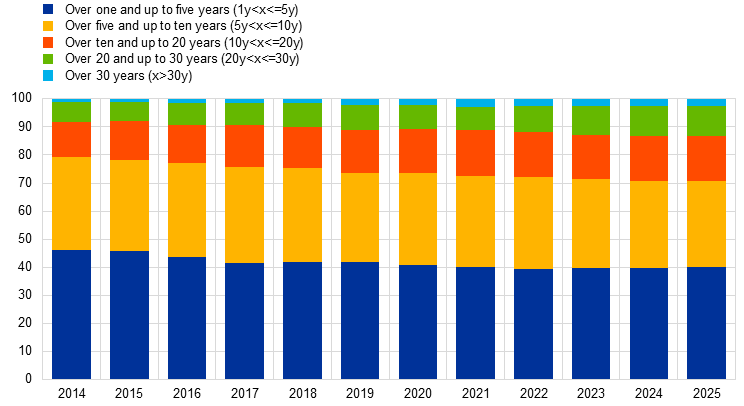The direct effects of a rise in very long-term yields on government funding costs are likely to be limited. The supply of very long-term sovereign debt has increased in recent years, both in absolute terms and relative to the share of debt outstanding (Chart B, panel a). This increased supply contributes, ceteris paribus, to higher yields at the very long end of the curve. However, any effects on overall government financing costs from the steepening of the 30-year to ten-year slope are expected to be limited. Around 70% of issuance is still in maturities of less than ten years and is therefore not directly affected by the higher very long-term rates. Furthermore, debt management offices can flexibly adjust the maturity structure of their issuance in response to changes in interest rates, enabling them to contain the implications of the yield curve steepening for sovereign funding costs.[1]