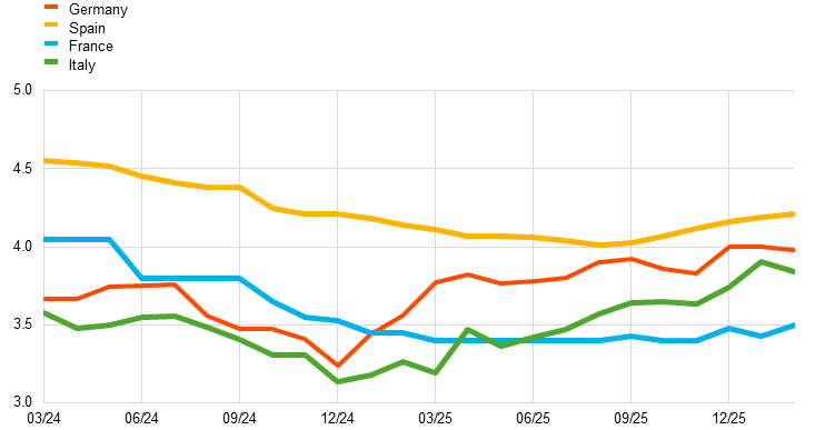 Notes: Panel a): replies from households in the bottom two groups of financial literacy have been discarded. Replies are weighted using population sampling weights and mortgage volumes at origination. Panel b): rates advertised online for mortgages with very long fixation periods. Panel c): changes in mortgage spreads since January 2025. In each country, mortgage spreads are the difference between the rates for mortgages with interest rate fixation periods as close as possible to 30 years and the rates for mortgages with interest rate fixation periods as close as possible to ten years. These are 30-year and ten-year periods in Germany, 25-year and ten-year periods in France, and 30-year and 15-year periods in Italy and Spain. The latest observations are for February 2025 for the CES and February 2026 for online advertised rates.