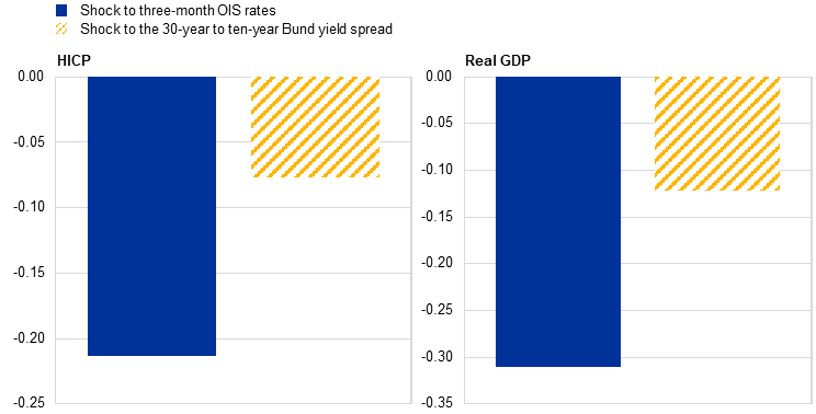 Overall, the macroeconomic implications of a steepening at the very long end of the yield curve are limited. While the above discussion indicates several counterbalancing transmission channels working through government financing costs, portfolio rebalancing and mortgage markets, empirical estimates show only limited effects from shocks to the long-end yield curve slope on euro area inflation and real GDP (Chart D, panel b). Compared with the effects of a conventional short-term rate shock, the response of HICP inflation – the ECB’s key metric for price stability – to changes in the long-end yield curve slope is more than three times smaller and not statistically significant. Similarly, real GDP declines somewhat after a steepening shock, but compared with a short-term rate shock the response is substantially smaller and statistically insignificant. Taken together, while a long-term yield curve steepening affects funding costs and financial intermediaries to different degrees, financial conditions and macroeconomic dynamics remain broadly unaffected.