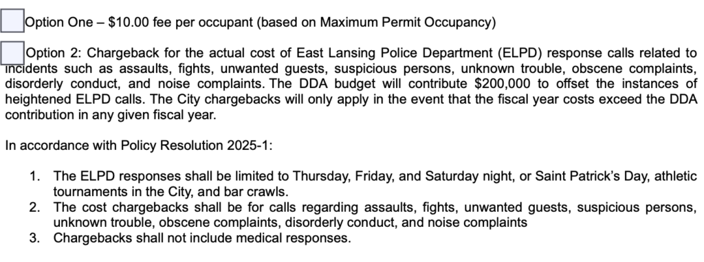 Last budget season, the city installed a new business fee model that aimed to charge bars that saw more public safety issues than others. The Downtown Development Authority contributed $200,000 for police overtime on Thursday through Saturday nights and other busy days downtown. After the $200,000 is expended, businesses are to pay for ELPD overtime costs associated with calls to their business.
