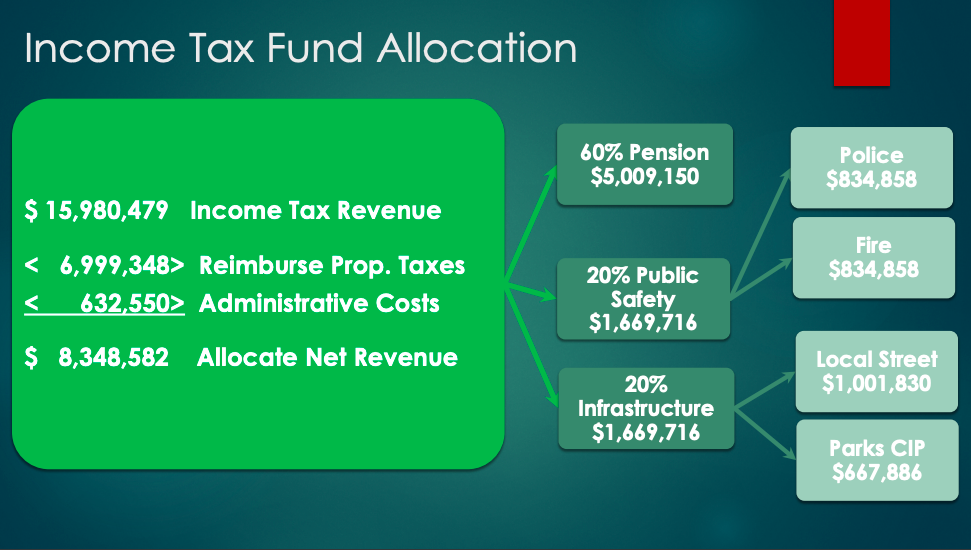 After the income tax reimburses the general fund for revenue lost by the property tax reduction, 60% of the tax goes to paying down the city’s pension liability, 20% goes to police and fire and 20% goes towards infrastructure.