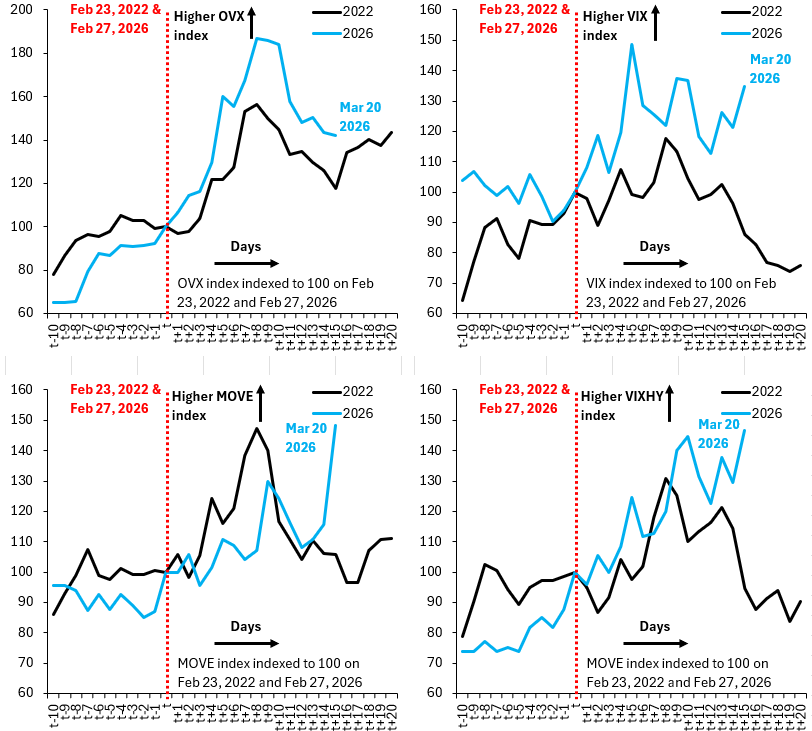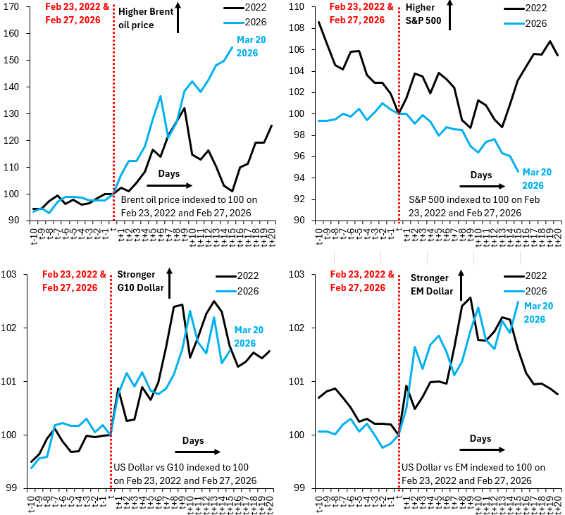 The four charts above are my tracking of what’s going on in spot markets. They show the evolution of the Brent oil price (top left), the S&P 500 (top right), the Dollar versus its G10 peers (bottom left) and the Dollar versus emerging markets (bottom right). The blue line is what’s happening now and the black line is what went on in 2022. In both cases, I’ve indexed things to be 100 the day before war began, which is Feb. 23, 2022, for Ukraine and Feb. 27, 2026, for Iran. It’s clear that we’re now tracking substantially worse than 2022 on Brent, the S&P 500 and emerging markets. Moves are still orderly, but they’re clearly headed in the wrong direction.