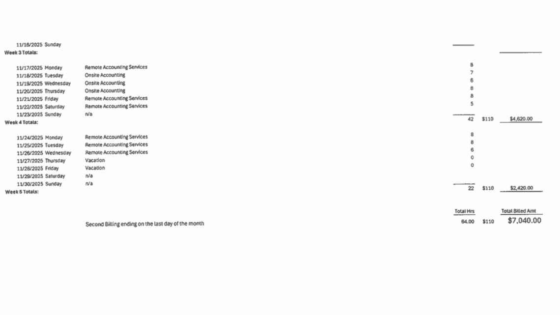 In the early months of the contract, monthly billing ran between $7,000 and $11,000 — consistent with the original 24-hour work week. But records show the billing spiked dramatically in later months: $33,000 in a single December invoice and another $18,900 in January 2026.
