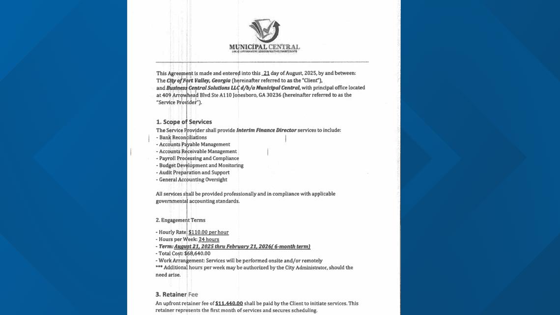 Fort Valley hired Municipal Central on Aug. 21, 2025, to handle day-to-day financial operations for the city — effectively serving as its interim finance director. The original contract, signed by then-City Administrator Gary Lee and Lamonte, called for 24 hours of work per week at $110 per hour for six months, totaling $68,640.