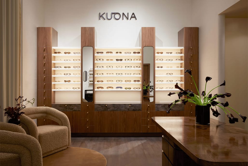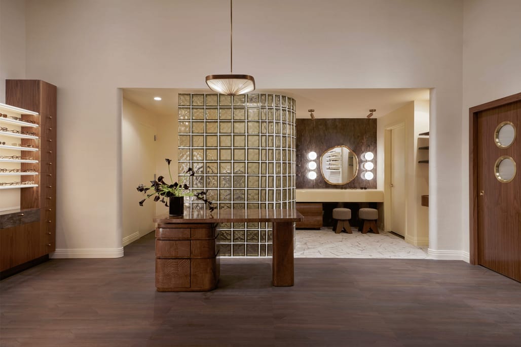 For Kuona, a concierge eye clinic in NoHo, Ringo Studio sought to create a hospitality-oriented alternative to the traditional medical interior. The project integrates retail, consultation, and waiting areas within a continuous, lounge-like environment. Walnut display columns, cream shelving, and integrated mirrors organize the main retail zone, while a sculptural burl-wood reception desk set against glass block defines the central space. Material choices include walnut, marble, lacquer, textiles, and tinted glazing, contributing to a warm, mid-century-influenced palette.