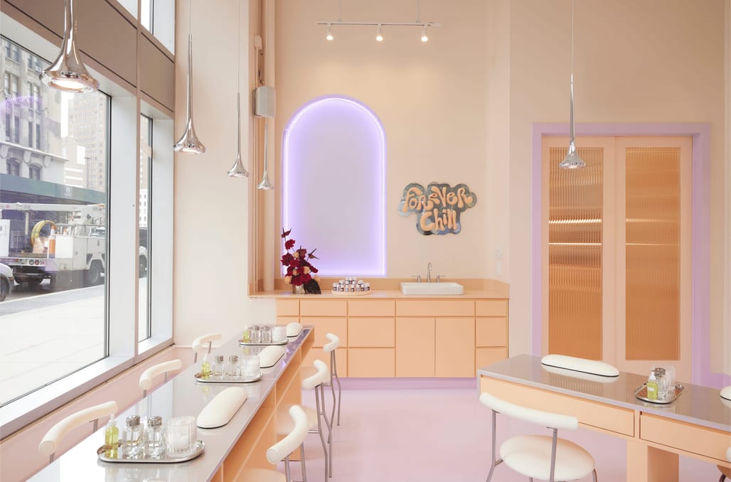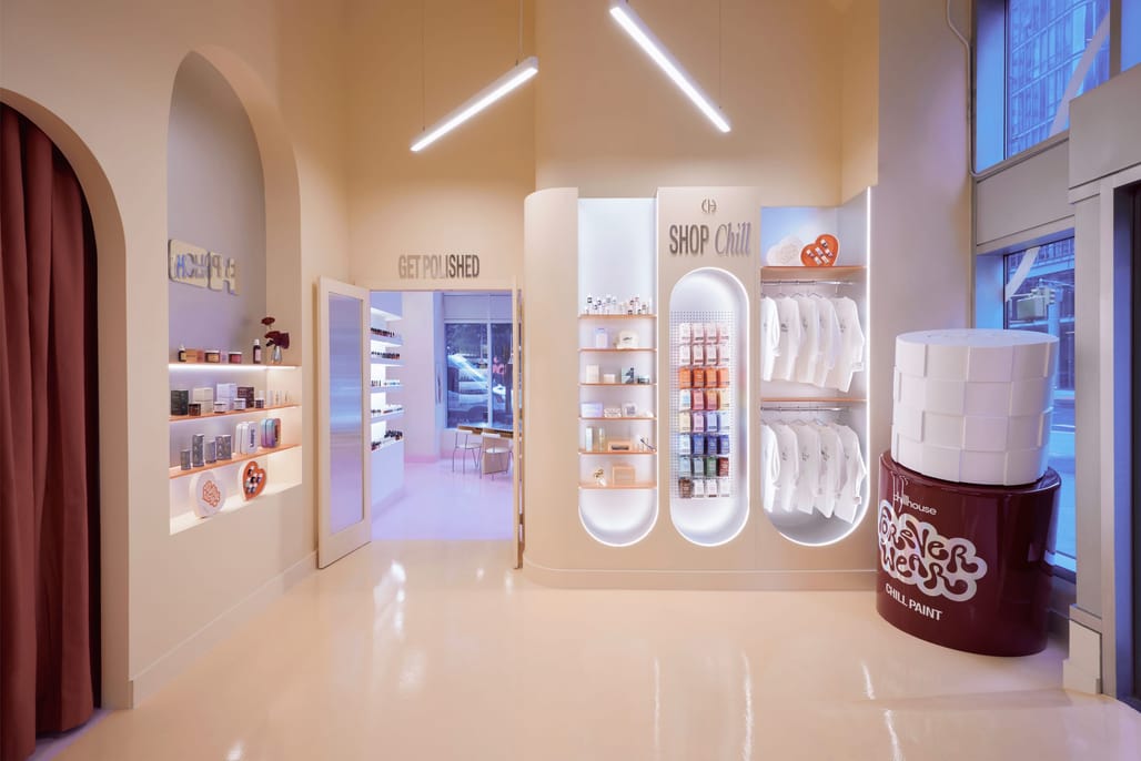 Ringo Studio redesigned the Chillhouse flagship in Soho to update the wellness brand’s original Varick Street location and support its expansion into retail and lifestyle products. The project reorganizes the interior around distinct zones for reception, retail, cafe seating, and nail services. A custom ten-foot retail wall with integrated lighting emphasizes product display, while terraced lounge seating introduces a communal focus within the cafe. Material updates include satin aluminum, high-gloss lacquer, limewash, epoxy flooring, and chrome accents.