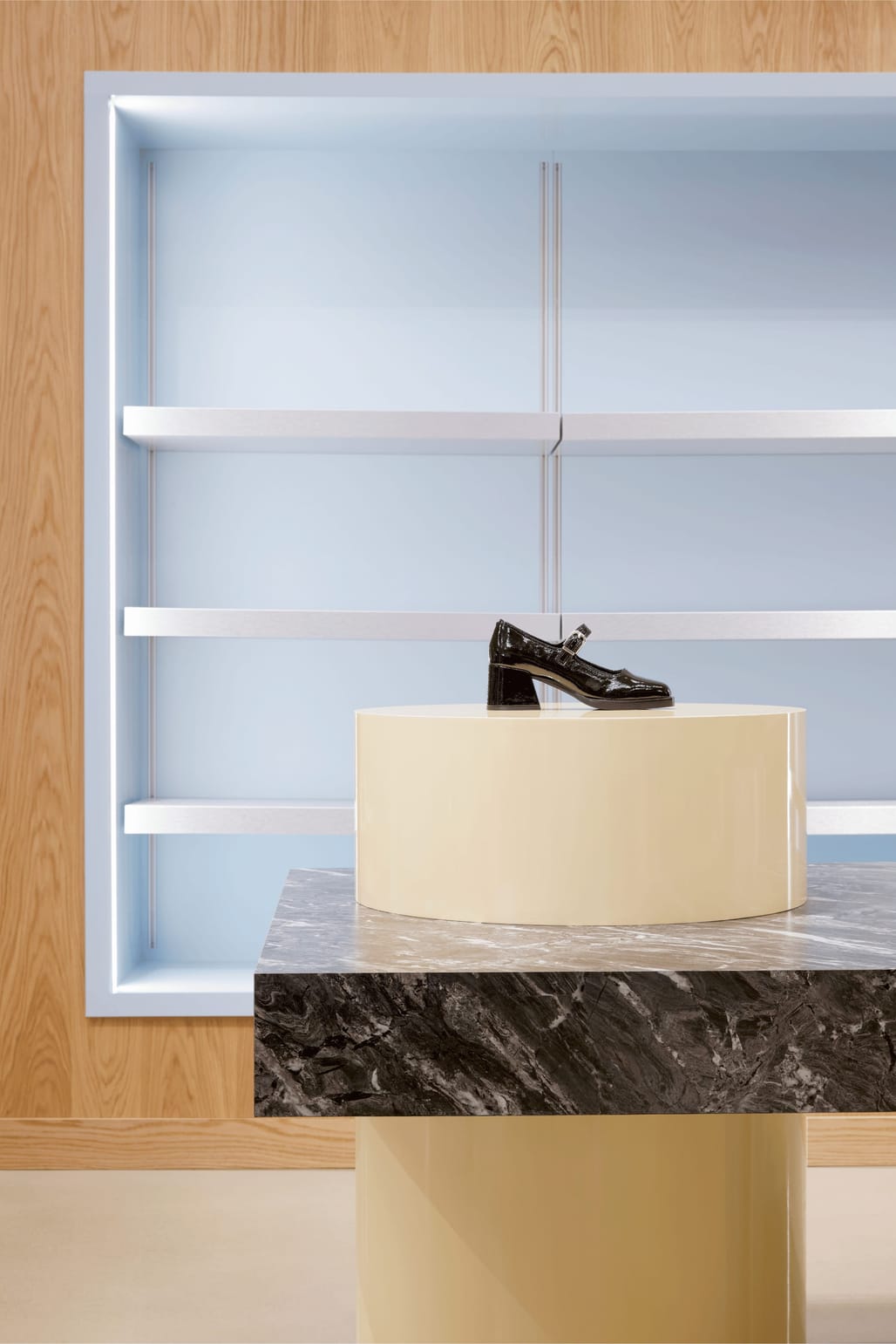 For Steve Madden’s international flagship store in Times Square, Ringo Studio sought to introduce a new spatial identity for the brand. The interior is organized around a sweeping oak colonnade that structures circulation while forming seating areas and display zones. Material contrasts between wood, black marble, travertine, concrete, and glossy tile define merchandising areas throughout the store. Suspended linear lighting responds to the curving walls and 18-foot ceiling height, while perimeter niches finished in bold colors frame product displays.