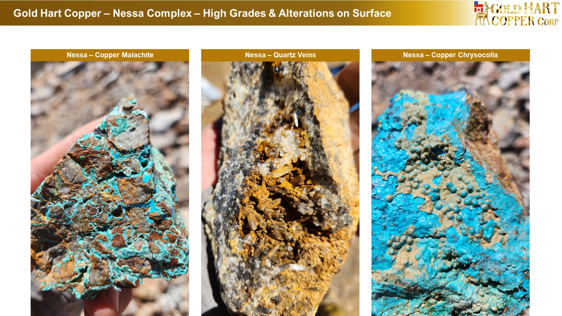 In addition to high grades on surface, the Nessa Complex was historically home to 13 artisanal gold and copper mining pits, where it is reported that high-grade minerals were mined using mules. Gold Hart has been planning a more comprehensive geochemical survey at the Nessa Complex, with a target of 500-1,000 geochemical samples gridding the property. Gold Hart will provide an update once this exploration campaign commences. Please refer to the notes regarding quality assurance and quality control measures applied during the execution of the work being reported on, at the end of this disclosure.