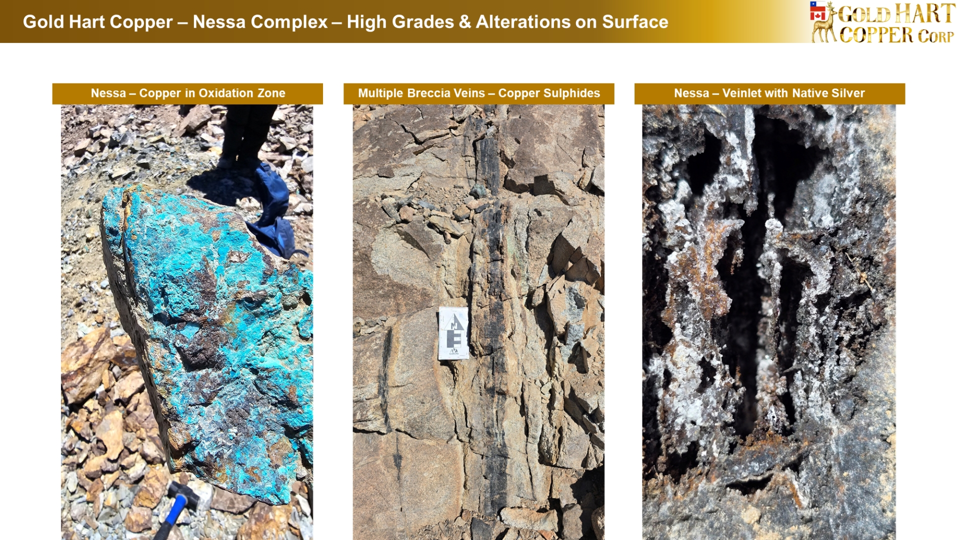 The Nessa properties were known to host 13 historic artisanal high-grade gold & copper pits, which were mined using mules due to lack of access. Additionally, historic geochemical surveys discovered high grades on surface for gold, copper, and silver, with samples up to 25g/t gold, 3.25% copper, 958g/t silver. However, the Company has now discovered additional copper showings on surface and historic mining pits, and now believes there may be other unknown targets on these assets. Gold Hart recently completed a follow-on geochemical survey and obtained additional high grade samples, including up to 9.7g/t gold, 968g/t silver, and 4.7% copper on surface.