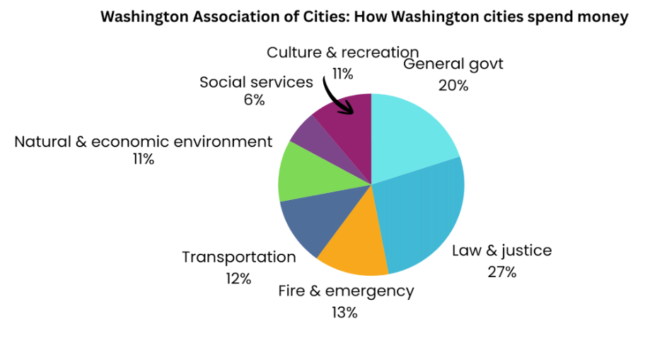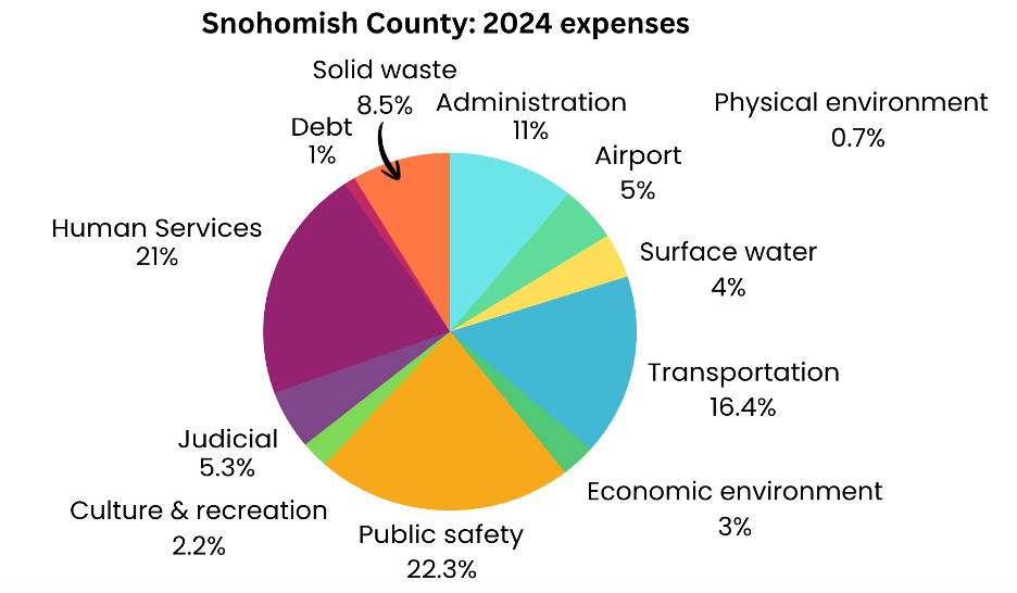 The two biggest pie slices in nearly every local Washington state government are public safety and administration. Public safety are the officers and people who support law/safety/justice.