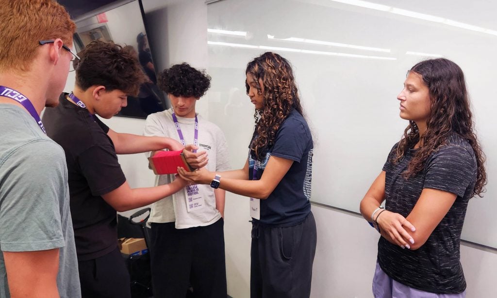 Then came the hands-on demonstration of taping the simulated patient’s fractured radius to a rigid device, the high schoolers in attendance watching intensely.
