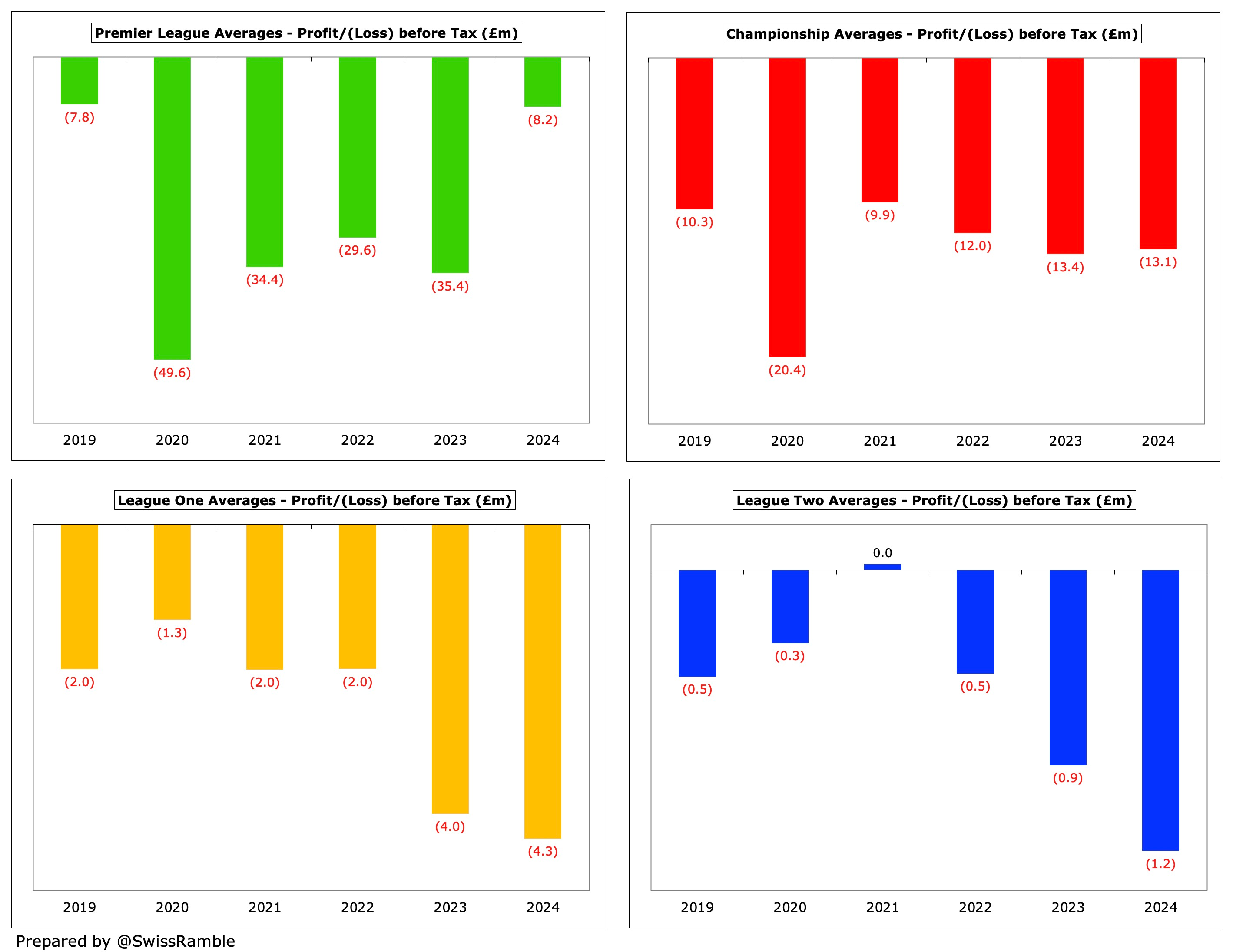 Although losses are much smaller in the lower leagues, it is striking how much they have increased in the last five years. In fact, they have more than doubled in both League One, up from £2.0m to £4.3m, and League Two, up from £0.5m to £1.2m.