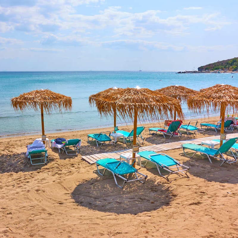 Glaroi Beach, tiny and tucked into a cove with a mix of pebbles and sandy patches, is backed by a beach bar slinging cheap drinks and snacks: your best bet for a relaxed seaside afternoon within short driving distance of Chios Town.