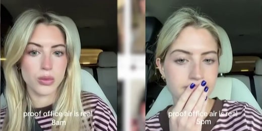 A TikTok trend has Gen Z and Millennial office workers sharing before-and-after photos at work, questioning whether the “office air” affects their appearance. NBC News’ Emilie Ikeda takes a look at the claims and how experts say there’s some truth to the theory.