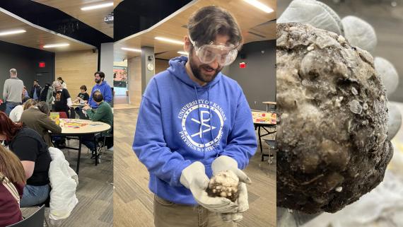 A collage of photos from a demonstration during a Pluto Day event in 2025 hosted by the University of Kansas’s Department of Physics and Astronomy. This demonstration built a “little Pluto” with dry ice and dirt.