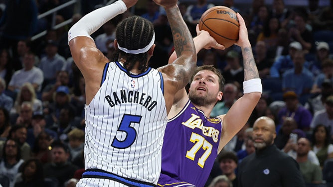 Los Angeles Lakers guard Luka Dončić shoots under Orlando Magic forward Paolo Banchero. (Stephen M. Dowell/Orlando Sentinel/Tribune News Service via Getty Images)