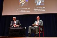 Dr. Jay Bhattacharya, the director of the National Institutes of Health, and Christopher Yeomans, the Justin S. Morrill Dean of the College of Liberal Arts, sit together Wednesday’s NIH Director Fireside Chat. The talk was part of America250, a celebration of 250 years of existence as a country and how that relates to research advancements.