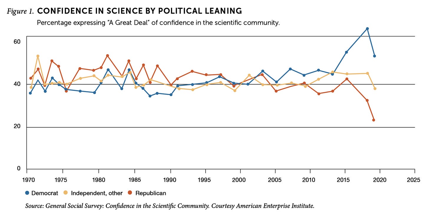 As we discussed in the chat, it’s not clear what scientists could or should be doing in this moment to increase faith in their work. As Mills notes, one of the chief complaints against scientists and professors is that they’ve become too political; scholars becoming even more political might not help them achieve their goals. This (mainly Republican-driven) anti-science era will end, of course, but it’s not clear what event will bring that about.