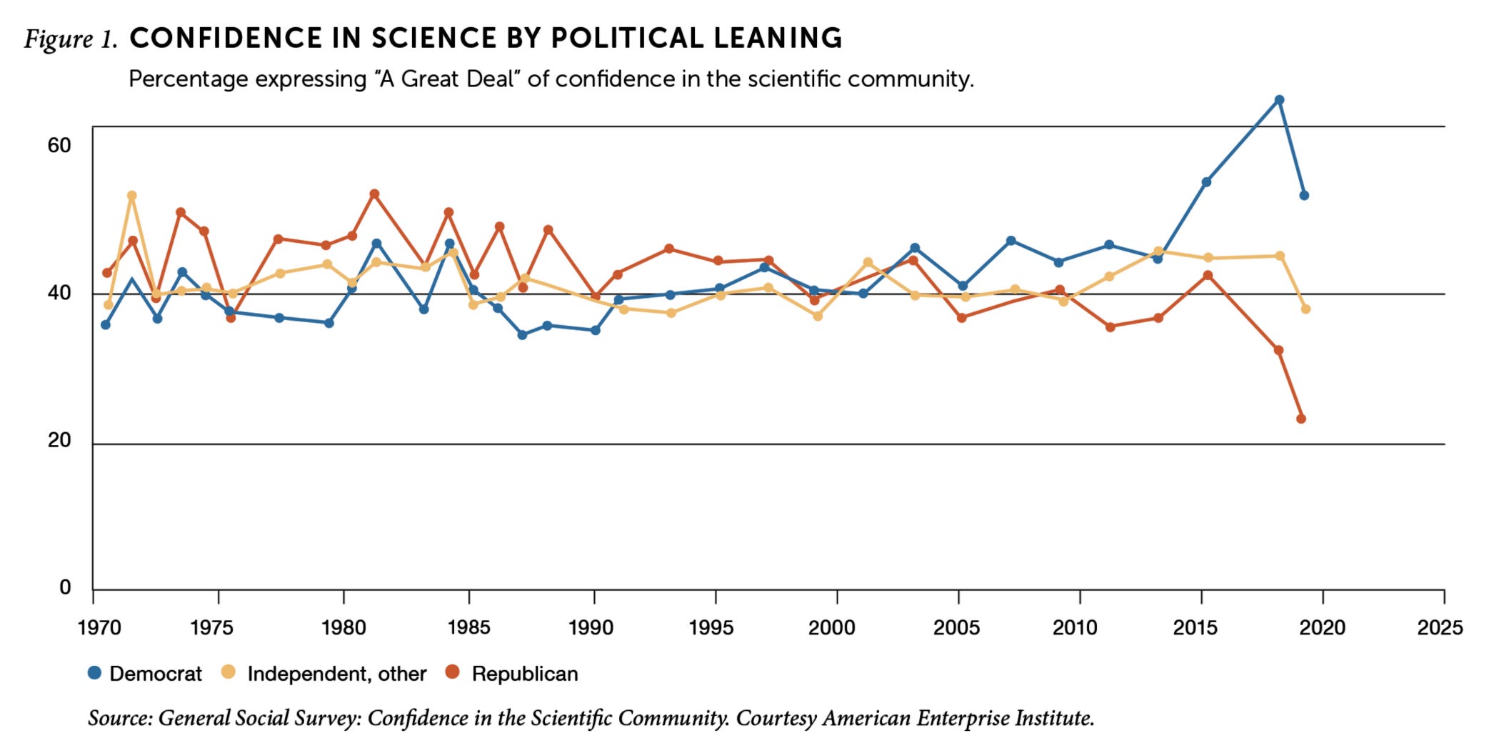 But as the graph also shows, the partisan divide has existed in the past, and it’s not always in the same direction. The largest divergence in party views toward science prior to 2016 was in the 1970s, when liberals equated scientific achievement with the military-industrial complex and thus trusted it less.