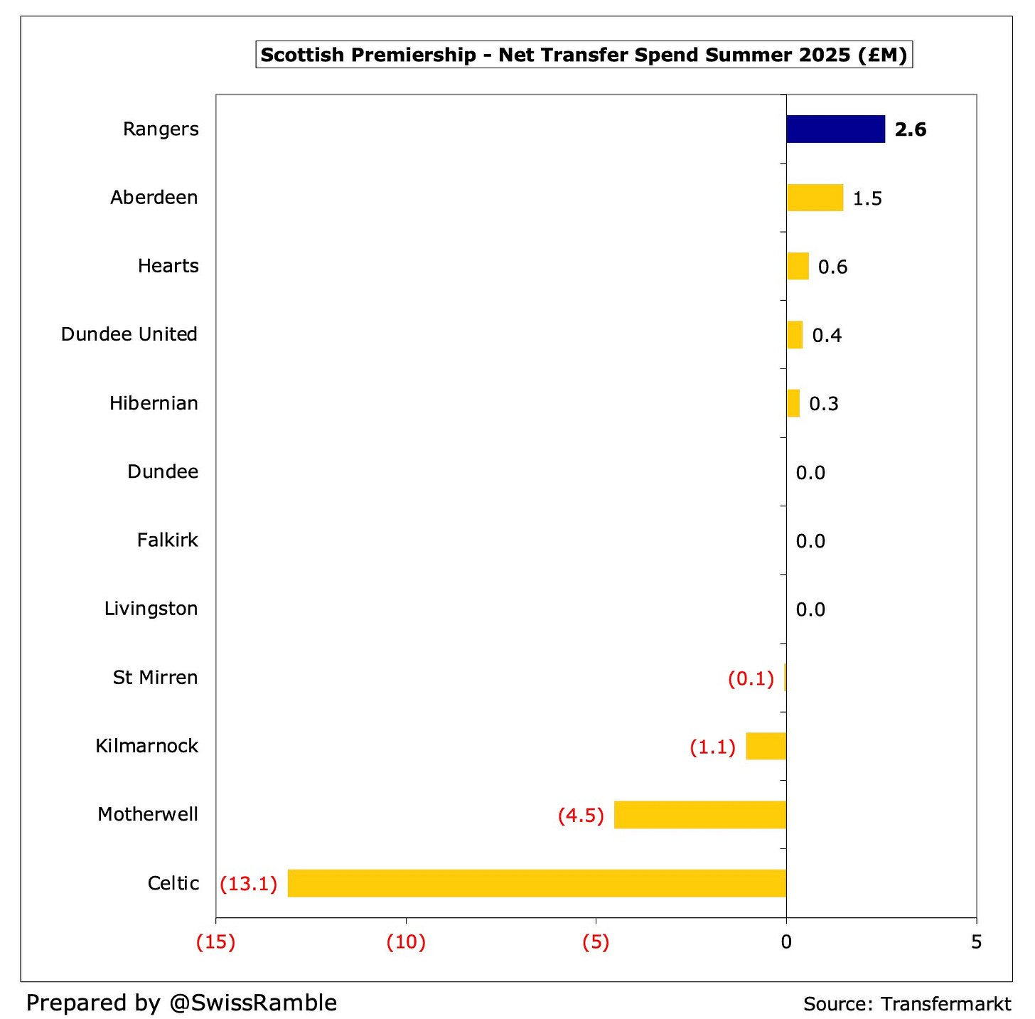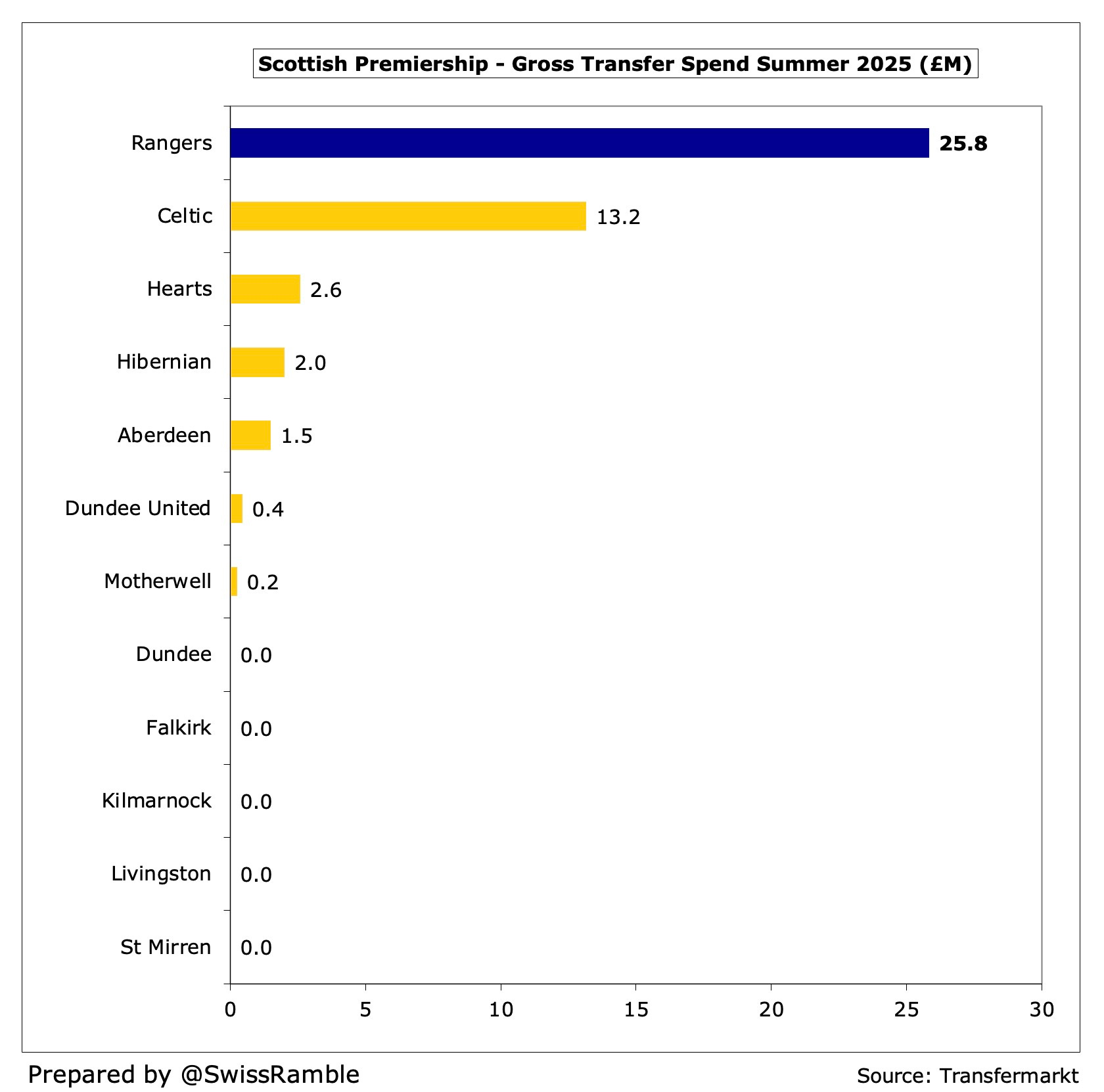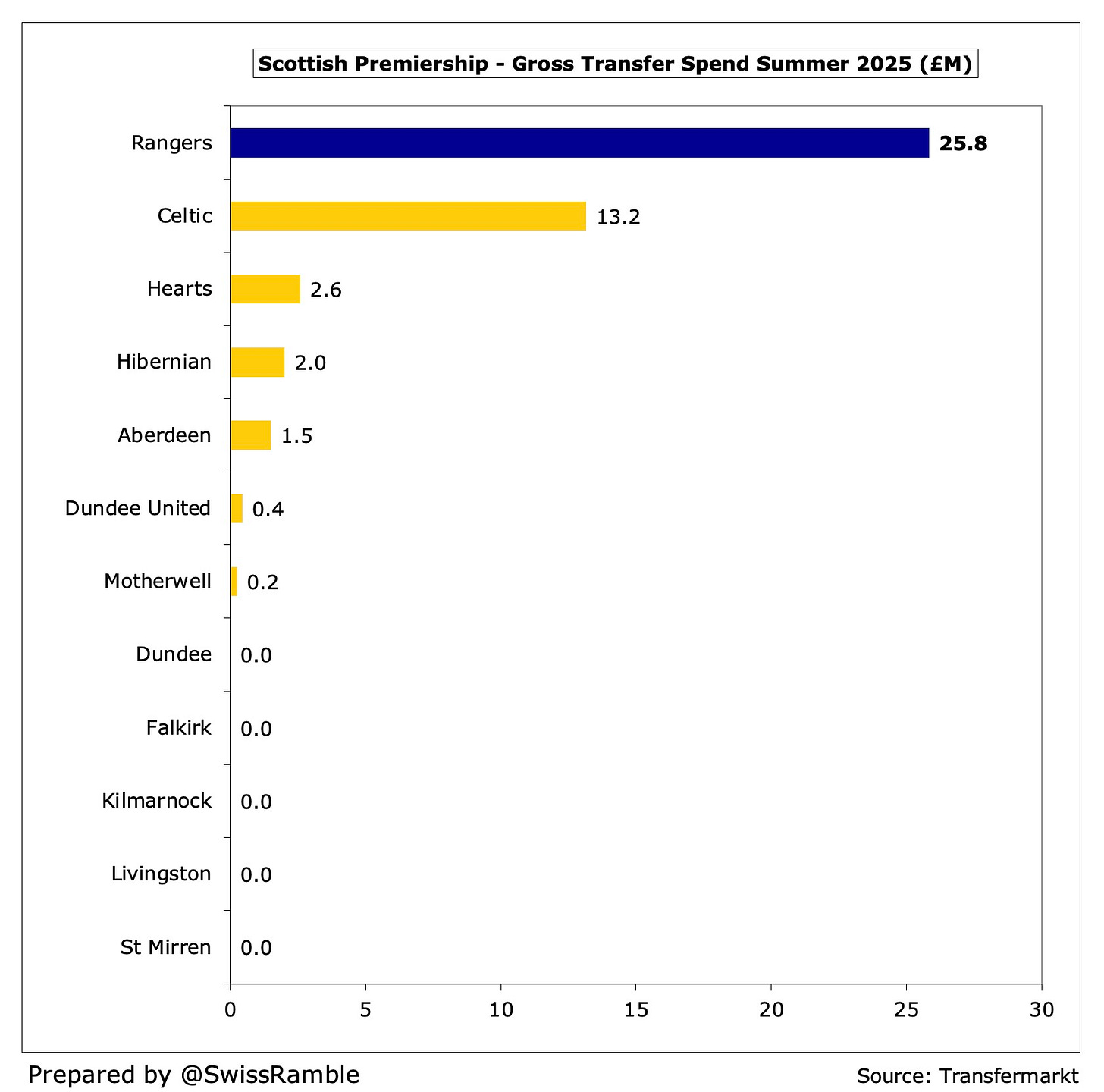 Rangers were also top of the pile in terms of gross spend, as their £25.8m was almost twice as much as Celtic’s £13.2m.