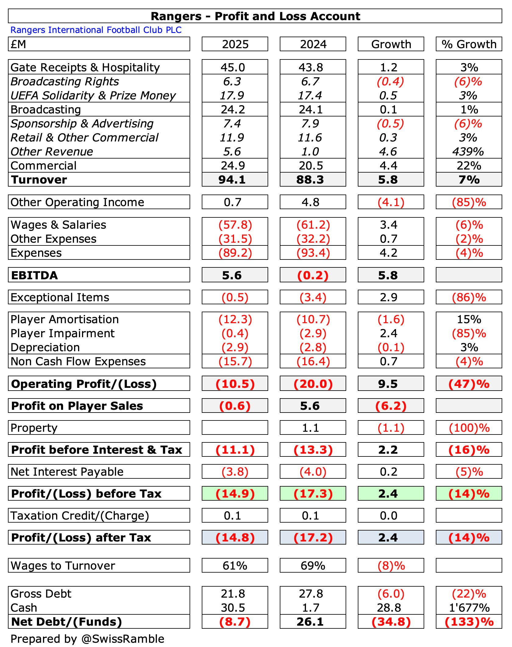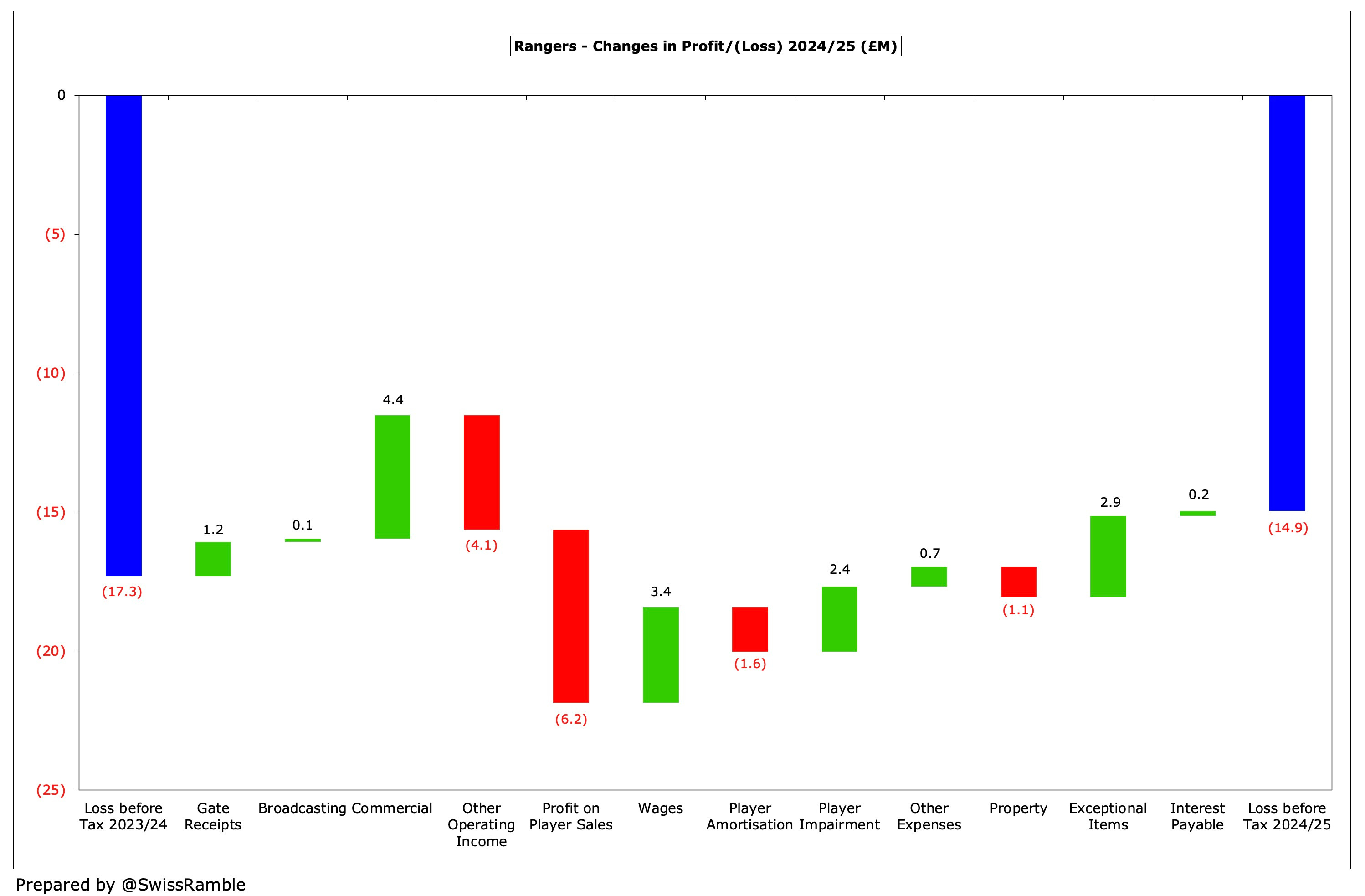 Ranger’s pre-tax loss narrowed by £2.4m (14%) from £17.3m, but it still came in at a hefty £14.9m. Revenue rose £5.8m (7%) from £88.3m to a club record £94.1m, but this was more than offset by a worse result in player sales, which swung from a £5.6m profit to a £0.6m loss.