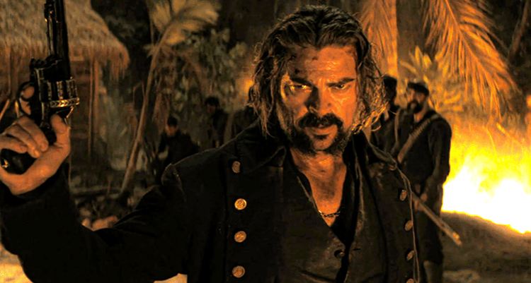 Co-written by Flowers and Joe Ballarini, “The Bluff” is set 1846 as the era of the pirates sailing the Caribbean Sea is coming to its end. Only the most brutal marauders remain, such as the notorious Captain Francisco Connor (played by a devilishly fun Karl Urban). In the film’s brief prologue we see Connor’s massive galleon overtake a smaller brigantine. His pirates ransack the ship and kill the crew, sparing only one man, T.H. Bodden (Ismael Cruz Córdova), who possesses a gold bar bearing Connor’s mark.