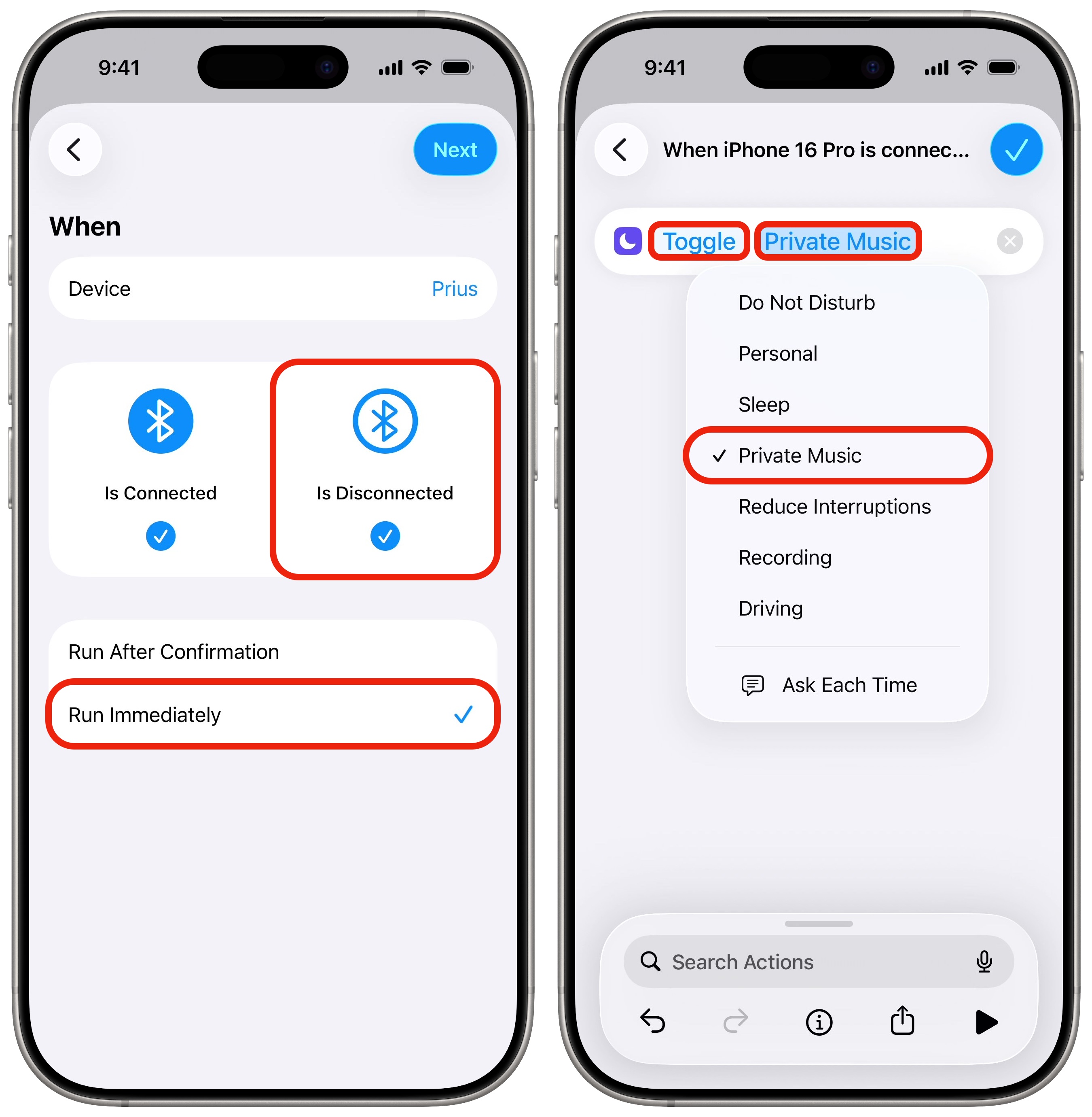 To set this up, open the Shortcuts app, tap the Automation tab and tap New Automation. Scroll down and tap either Bluetooth or CarPlay. Set it to run both when it Is Connected and Is Disconnected. Also set it to Run Immediately.