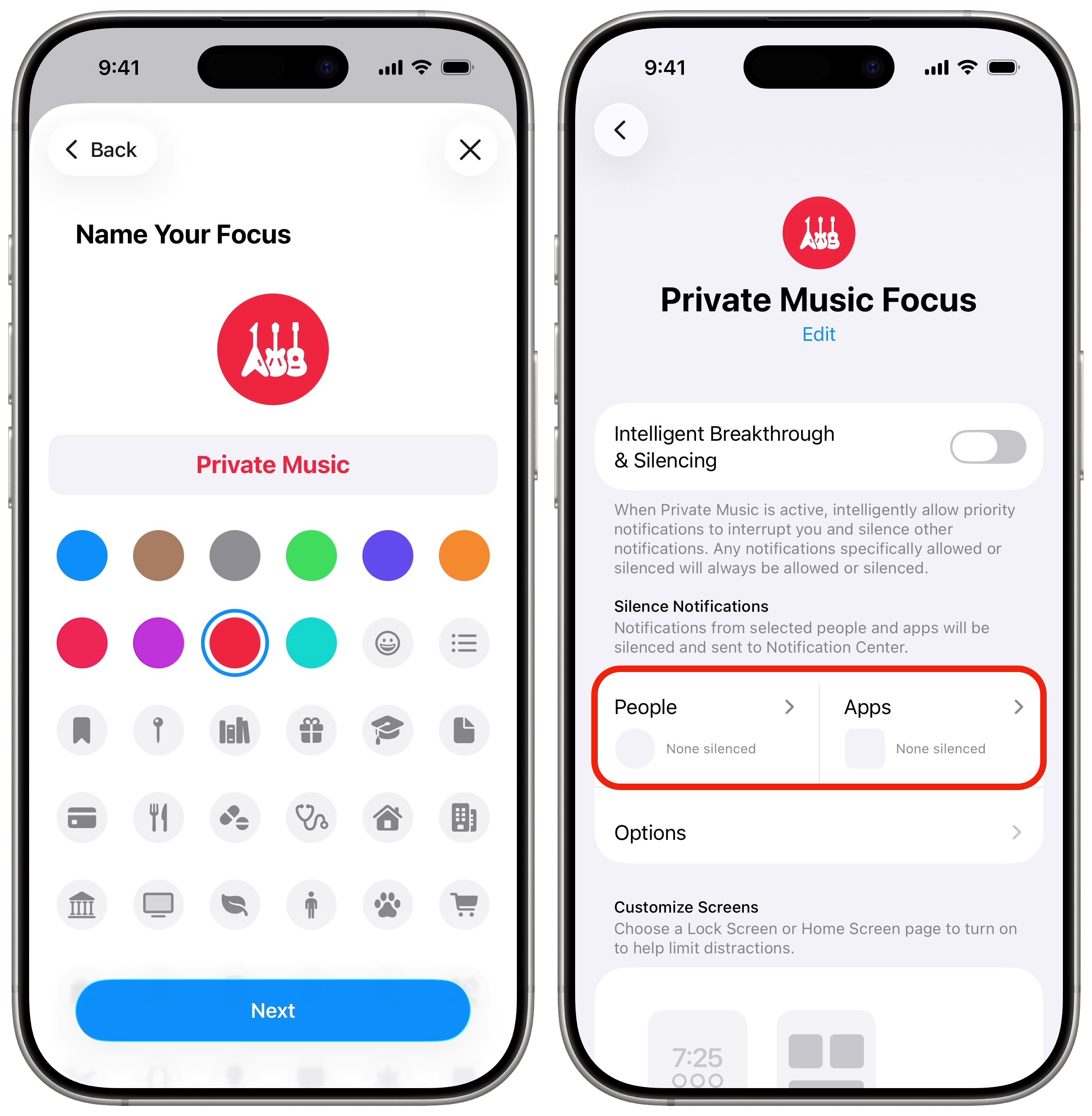 First, go to Settings > Focus and tap Add (+) in the upper right. Tap Custom. Give it a name, like “Private Music.” I give it a red color (like the Music app) and the icon of the guitar. Then, tap Customize Focus.