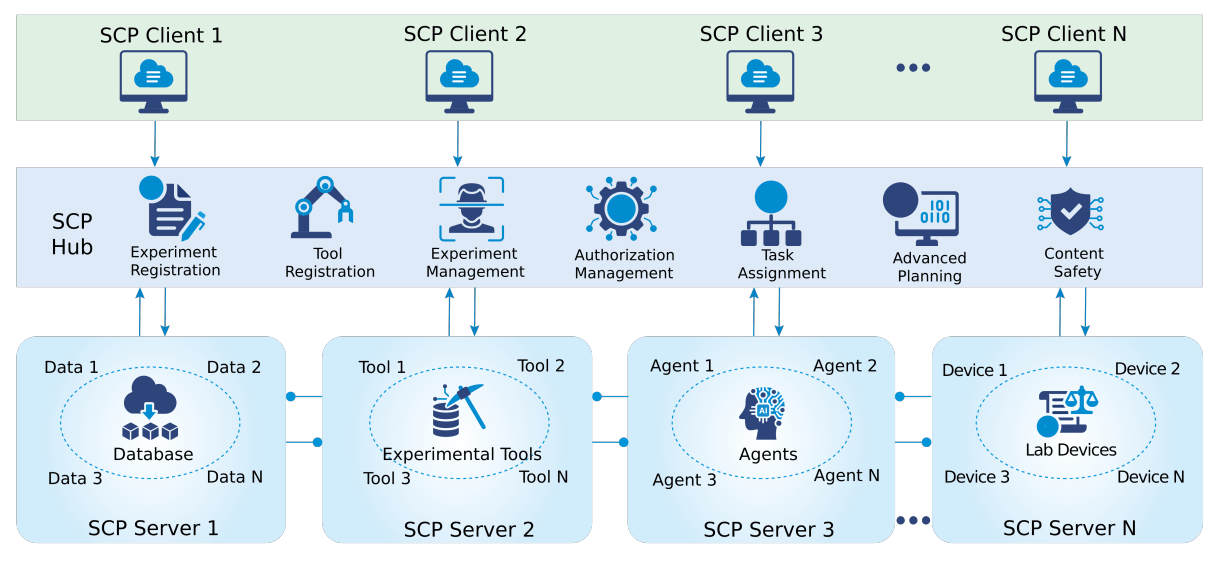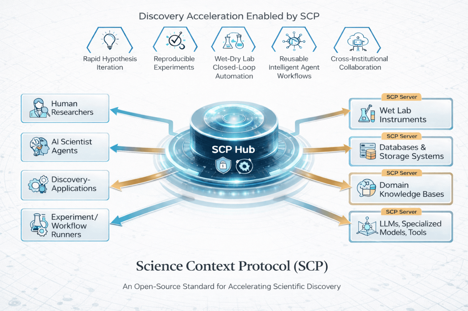 SCP rests on two foundations. The first is standardized resource integration: the protocol defines a universal specification for describing and accessing scientific resources, everything from software tools and AI models to databases and physical lab instruments. This lets AI agents discover and combine capabilities across platforms and institutions.