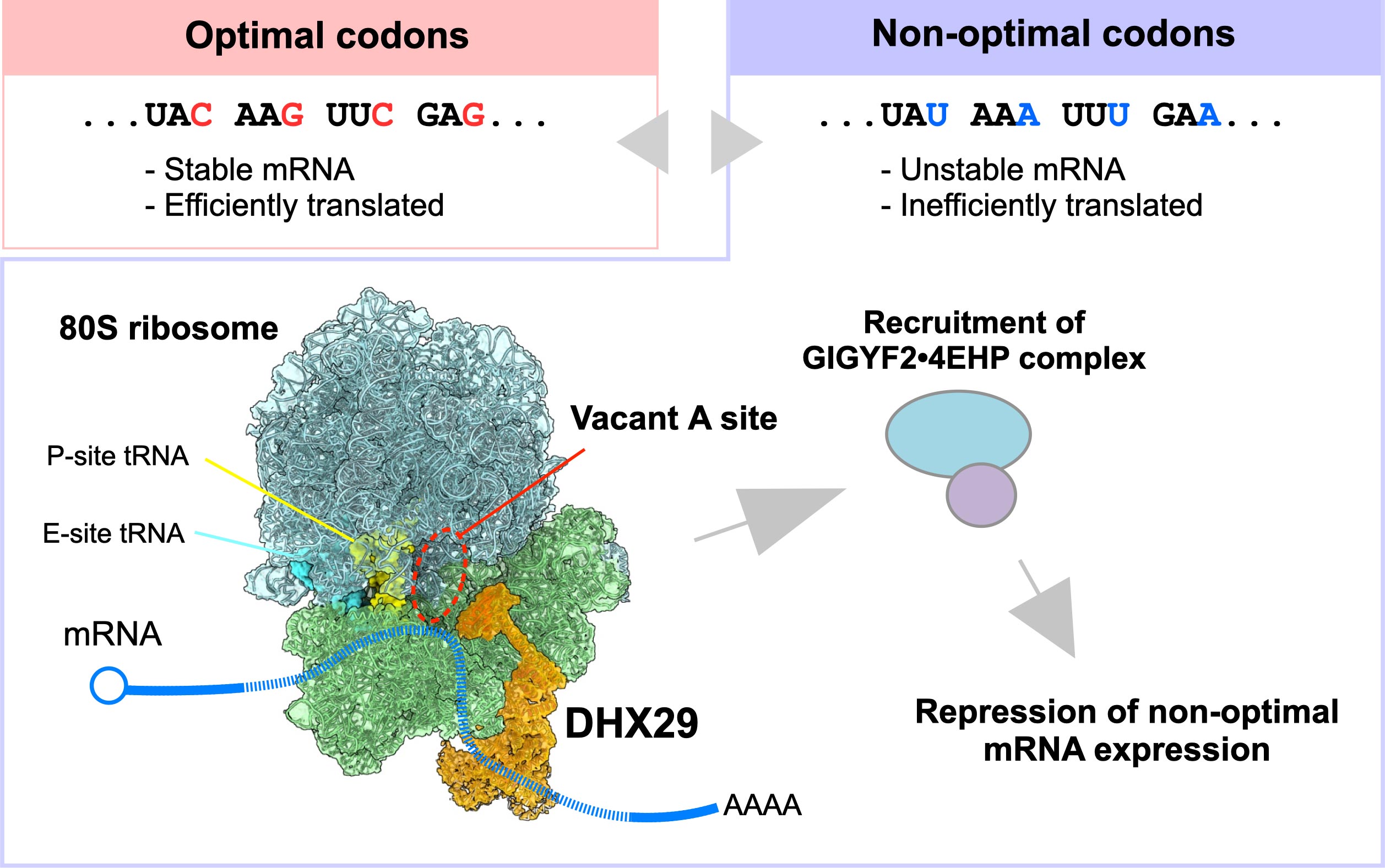 The results showed that DHX29 tends to bind ribosomes that are decoding non-optimal codons. Proteomic analyses further revealed that DHX29 recruits the GIGYF2•4EHP protein complex, which selectively suppresses mRNAs enriched in non-optimal codons.
